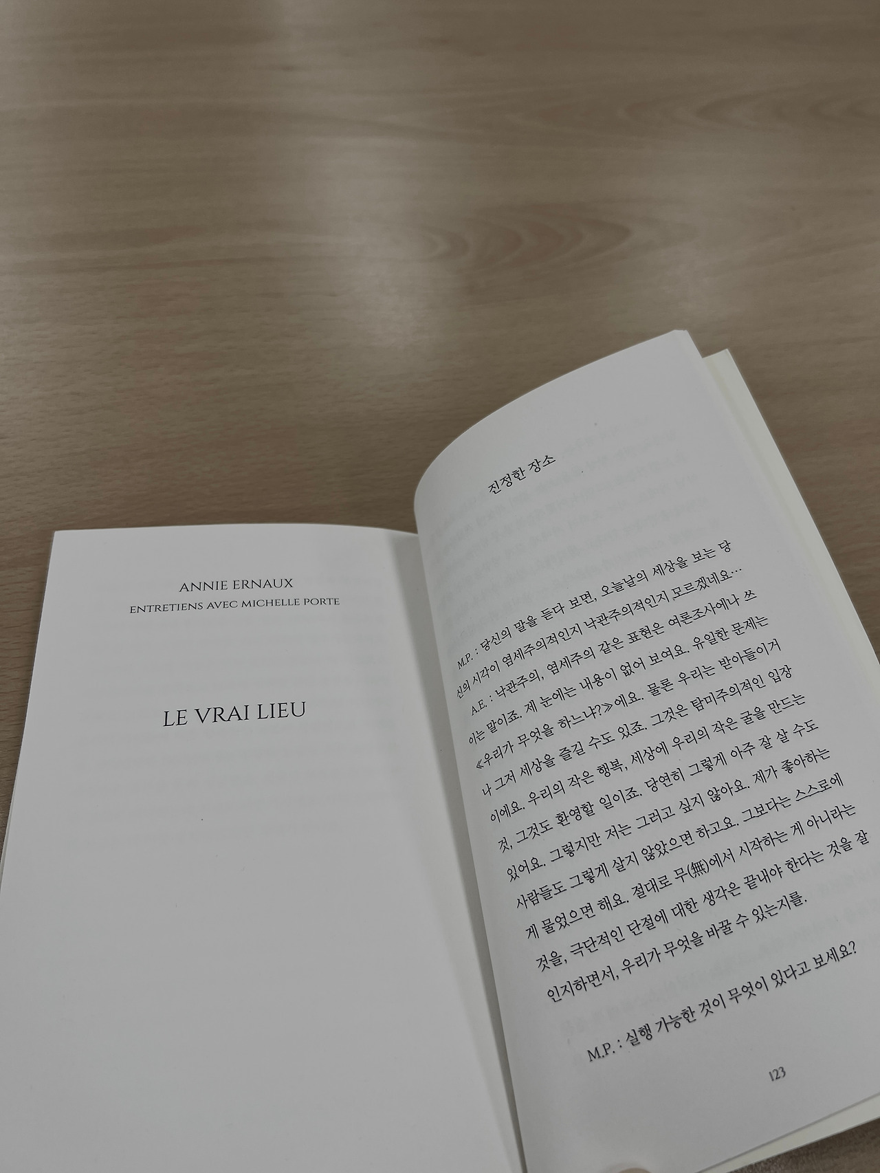 <진정한 장소>를 읽으면서는 앞서 읽은 두 책으로 인해 물밀듯 몰려온 복잡한 감정들이 조금이나마 해소가 되는 느낌을 받았다. 인터뷰 집이라 먼저 읽은 두 작품에 대한 작가의 설명이 아주 조금 더 (...) 들어가 있다. 세 책을 왔다 갔다 하며 해설집 읽듯 읽었다.