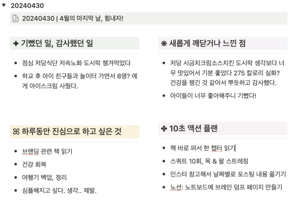 소소하지만 기쁘고 감사했던 일, 깨닫거나 느낀 점, 하고 싶은 것, 10초 액션 플랜까지 호다닥 썼다.
