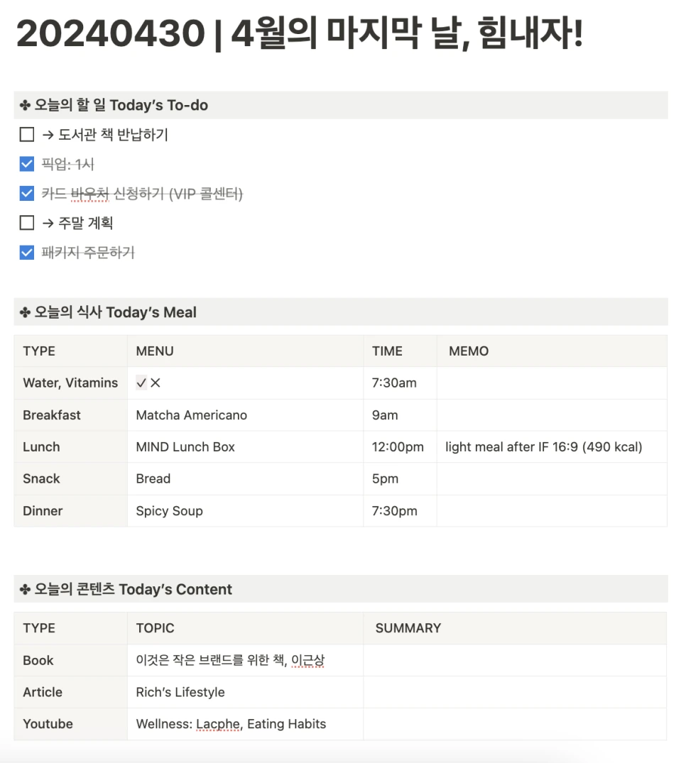오늘의 식사와 오늘의 콘텐츠를 기록했다.