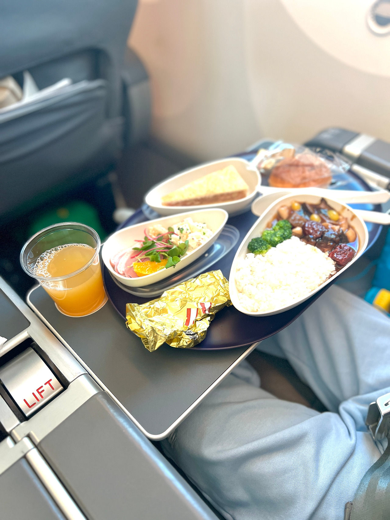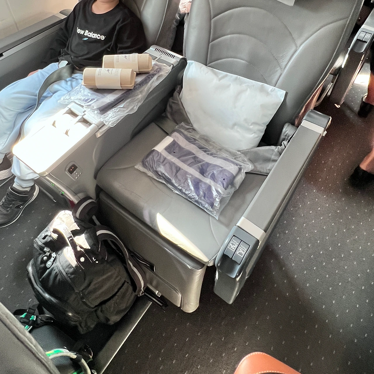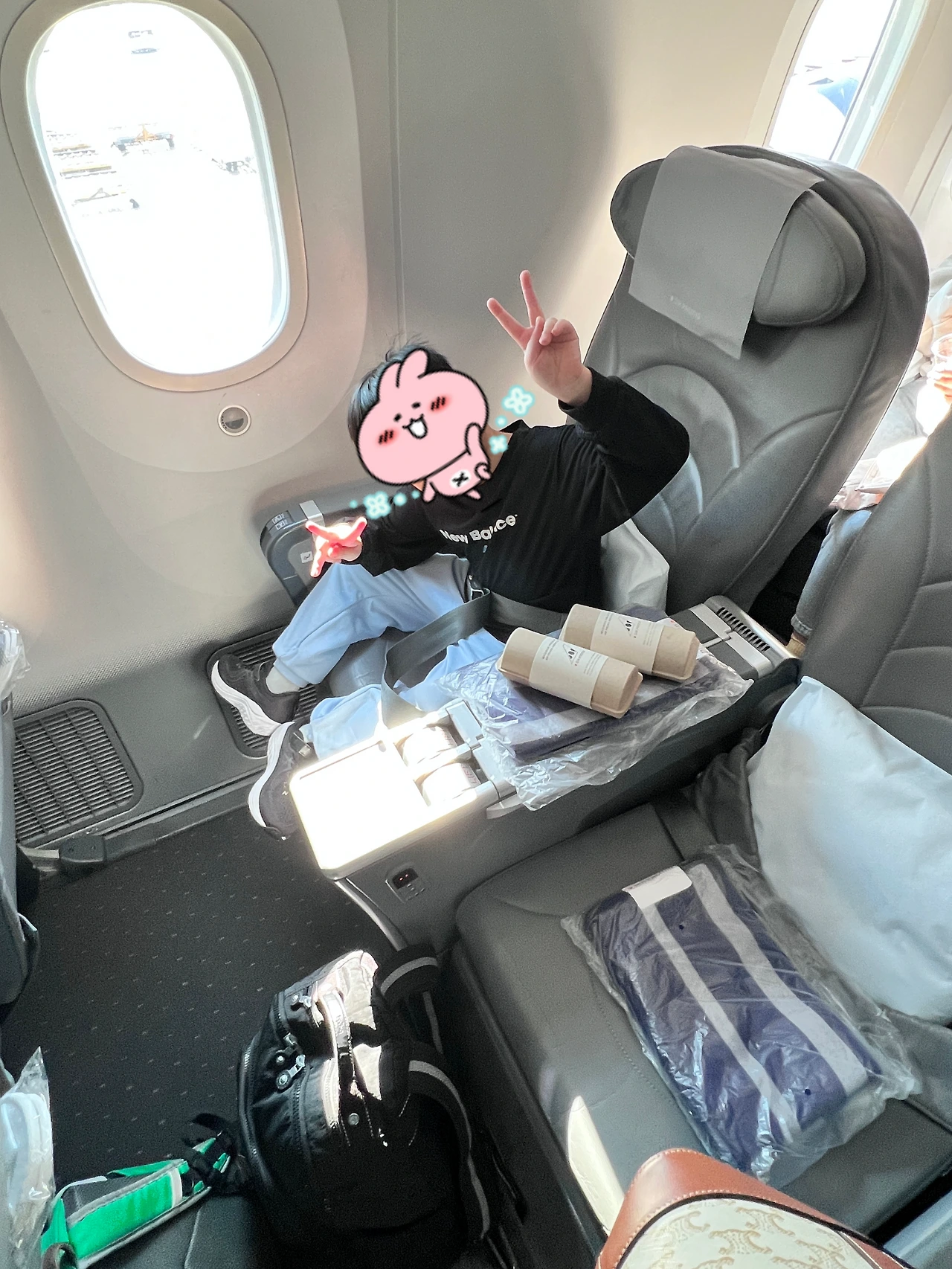 평소에도 워낙 잘 붓는 편이라 비행 시에 반드시 의료용 압박 스타킹을 신기는 하지만, 자리가 넉넉하다 보니 다리를 편히 움직일 수 있어 스타킹 없이도 다리가 붓지 않았다! 또, 아이랑 둘만 장거리 비행이다 보니 칸막이로 둘러싸인 비즈니스석보다 바로 옆에서 아이 케어하기에도 훨씬 편리했다.