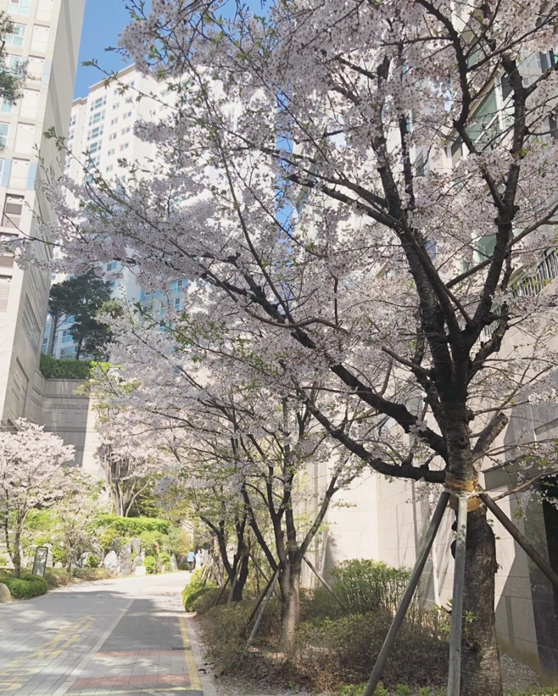 아파트 단지 내에 가득 핀 벚꽃 나무 아래를 지나는데