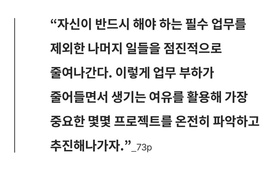 기회를 위해 달려드는 것도 물론 필요하지만, 중요한 업무부터 정하고 나머지 일은 간소화해야겠다고 다짐했다. 어찌 보면 당연한 소리인 듯싶어도 평소에 의식하지 않으면 놓치기 쉬운 부분이다.