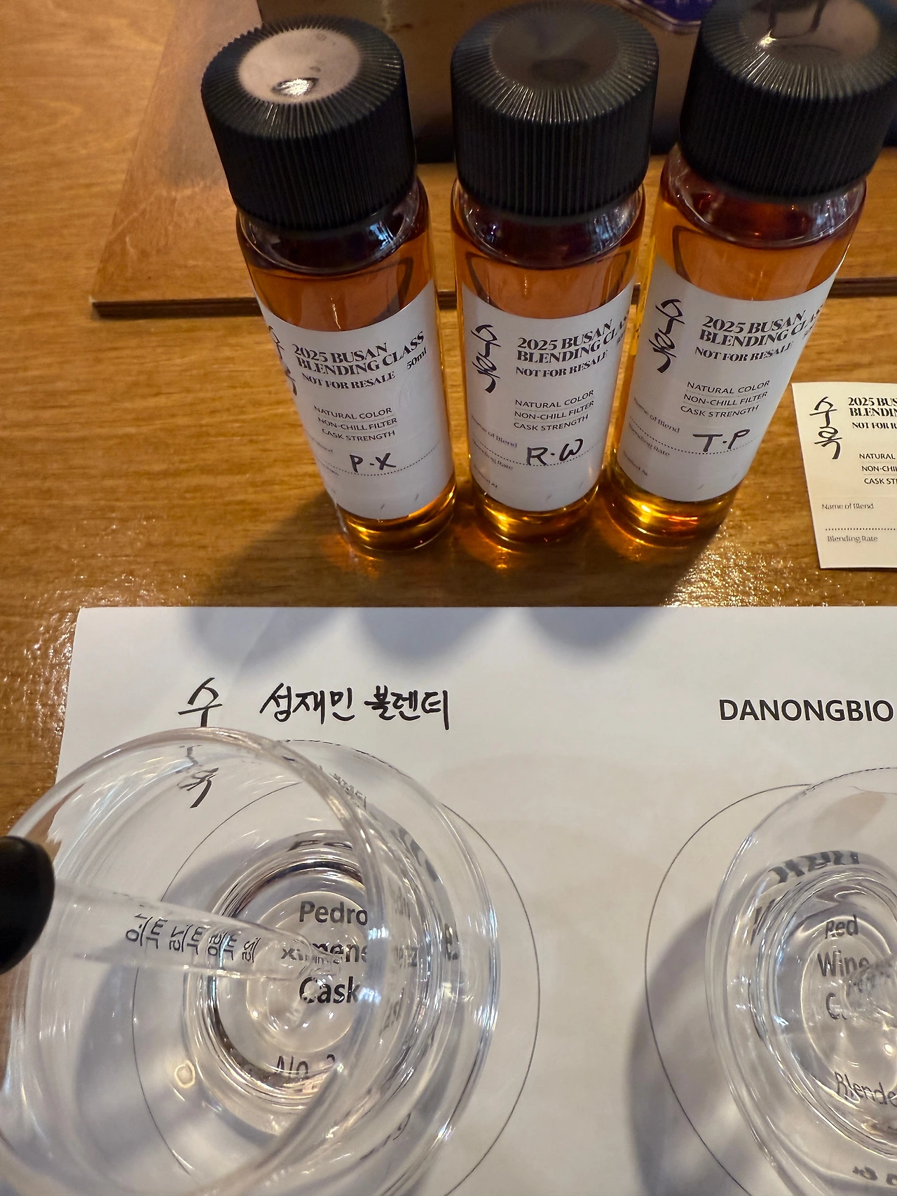 각 원액을 테이스팅 한 후, 간단한 블렌딩에 대한 팁을 듣고 블렌딩이 시작되었다. 개인적으로 포트캐스크를 좋아하했기에 포트캐스크의 개성을 살리는 쪽으로 방향을 잡았다. 처음에는 포트, PX, 레드와인을 3:1:1로 블렌딩 했는데 정말 이도저도 아닌 애매한 맛이었다. 두 번째 블렌딩 때엔 포트캐스크의 비율을 확 높였더니 꽤 괜찮은 결과가 나왔다. 세 번째에는 조금 더 밸런스에 신경을 쓰기 위해 레드와인의 비율을 높였는데, 두 번째 블렌딩보다 별로였다. 마지막 블렌딩은 포트, 레드와인, PX 6:3:1 비율로 블렌딩을 이번에도 괜찮았다. 두 번째와 네 번째 블렌딩 중 하나를 결정하기 위해 고민했는데 두 번째는 포트의 개성이 너무 강했기에 네 번째 블렌딩으로 결정했다. 원액의 장점을 살리고 단점을 보완하며 블렌딩 비율을 조정하는 일이 생각보다 매우 어려웠다. 내가 만든 블렌딩의 이름을 지을 수 있었는데 딱히 떠오르는 게 없어 비워놨다.