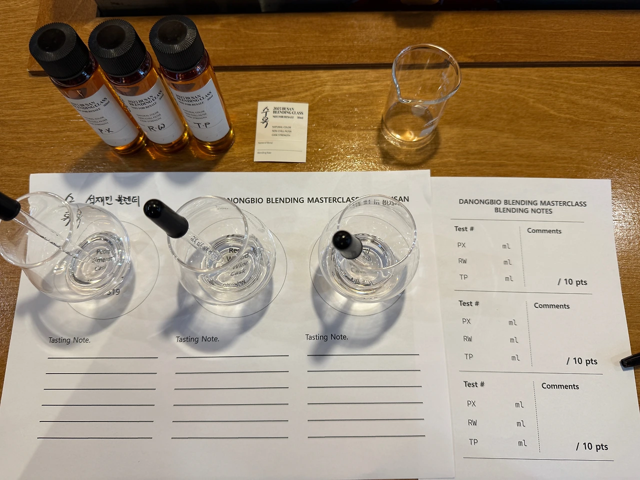 클래스는 다농바이오에 대한 소개, 디스틸러 고준님 소개, 테이스팅, 블렌딩, 순위발표 순으로 진행되었다. 먼저 테이스팅 때 각 원액들의 테이스팅 노트를 적는 시간이 있었다. 위스키에 막 입문했을 때에는 테이스팅 노트를 많이 썼지만 최근에는 거의 신경 쓰지 않고 마셨다. 그러다 보니 더더욱 위스키 맛이 세세하게 나뉘지 않고 뭉쳐져서 느껴지기도 했고, 한편으로는 세부적인 테이스팅 노트의 필요성을 느끼지 않았기도 하다. 오랜만에 테이스팅 노트를 적으려니 조금은 막막하기도 했지만, 비슷한 맛과 향을 찾아내는 작업이 나름 재미있었다.