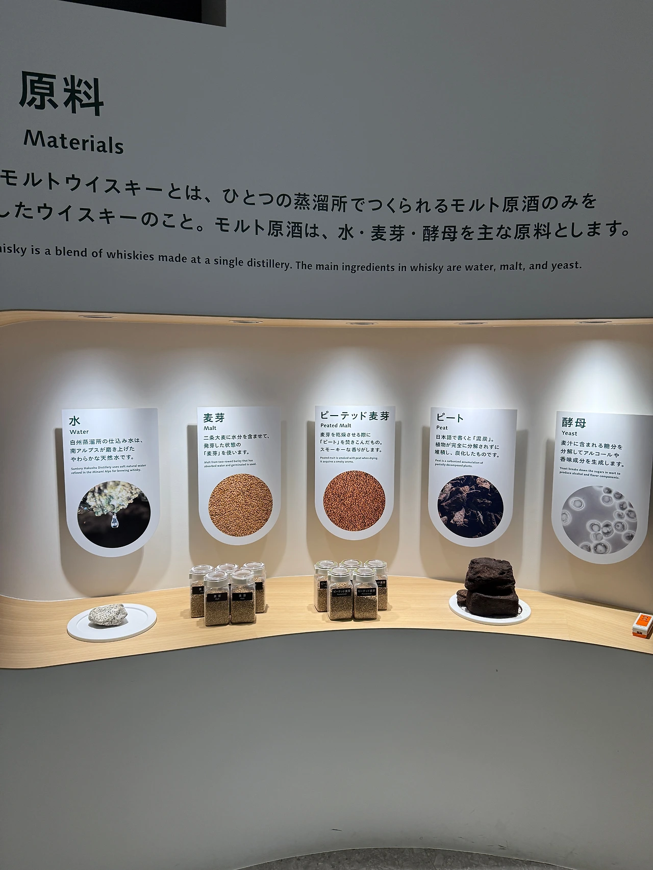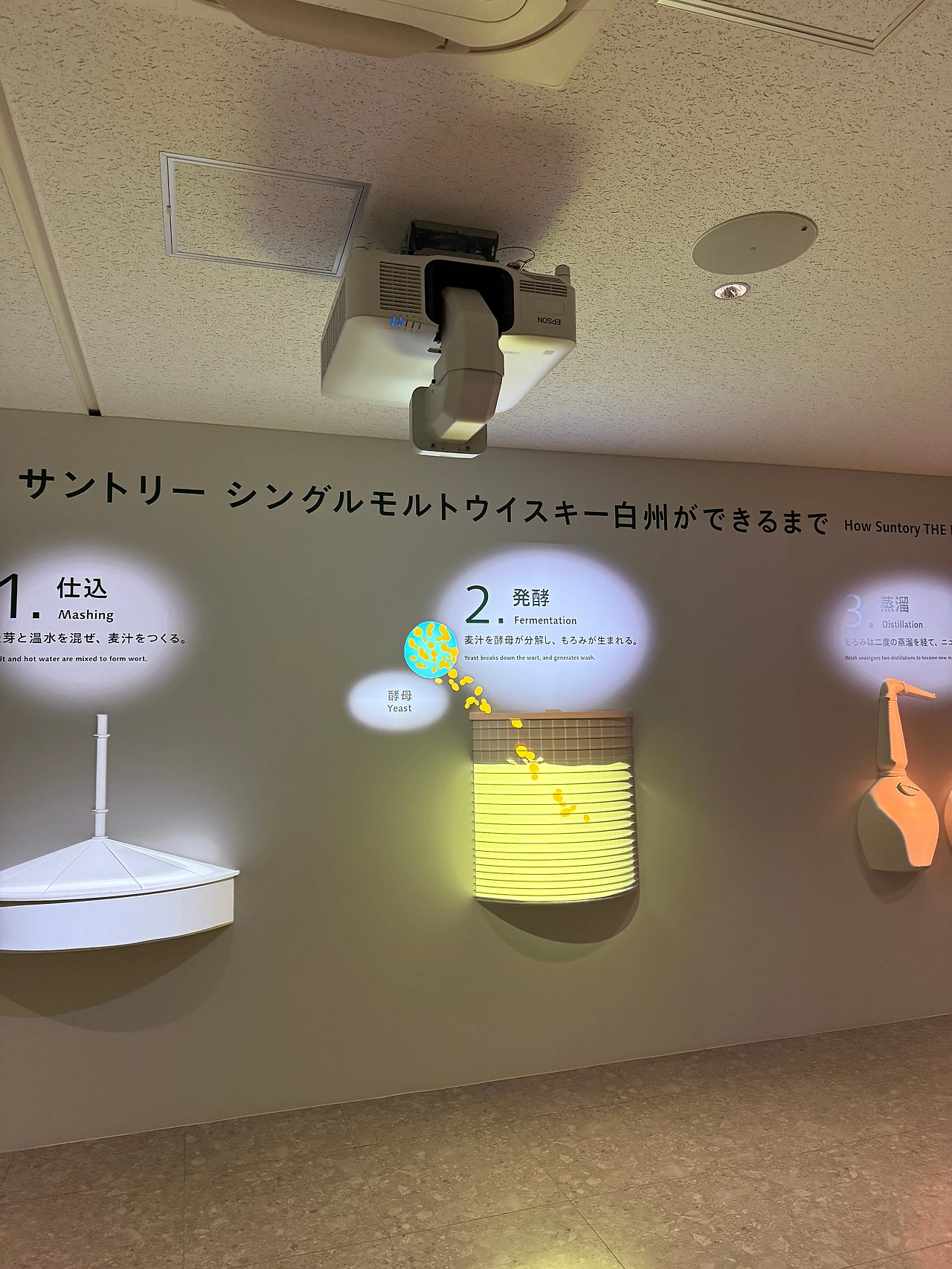 하쿠슈 증류소는 매우 넓었다. 처음에는 이동하여 위스키를 만들 때 쓰이는 여러 재료들을 구경했고, 위스키가 생산되는 과정을 보았다. 설치되어있는 모형물에 빛을 비추어 보여주는 것이 인상깊었다. 그 과정에 따라 본격적으로 투어가 시작되었다.