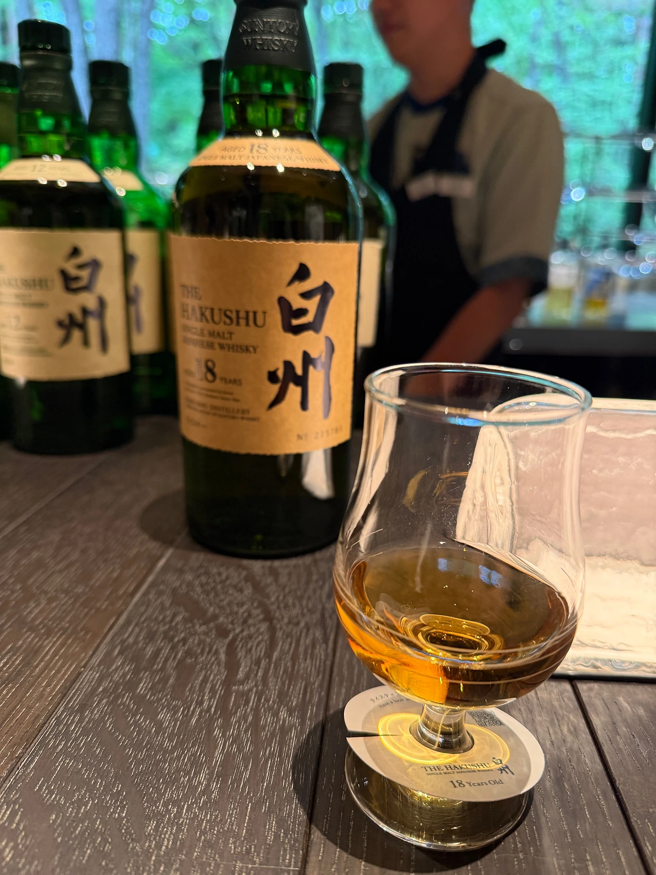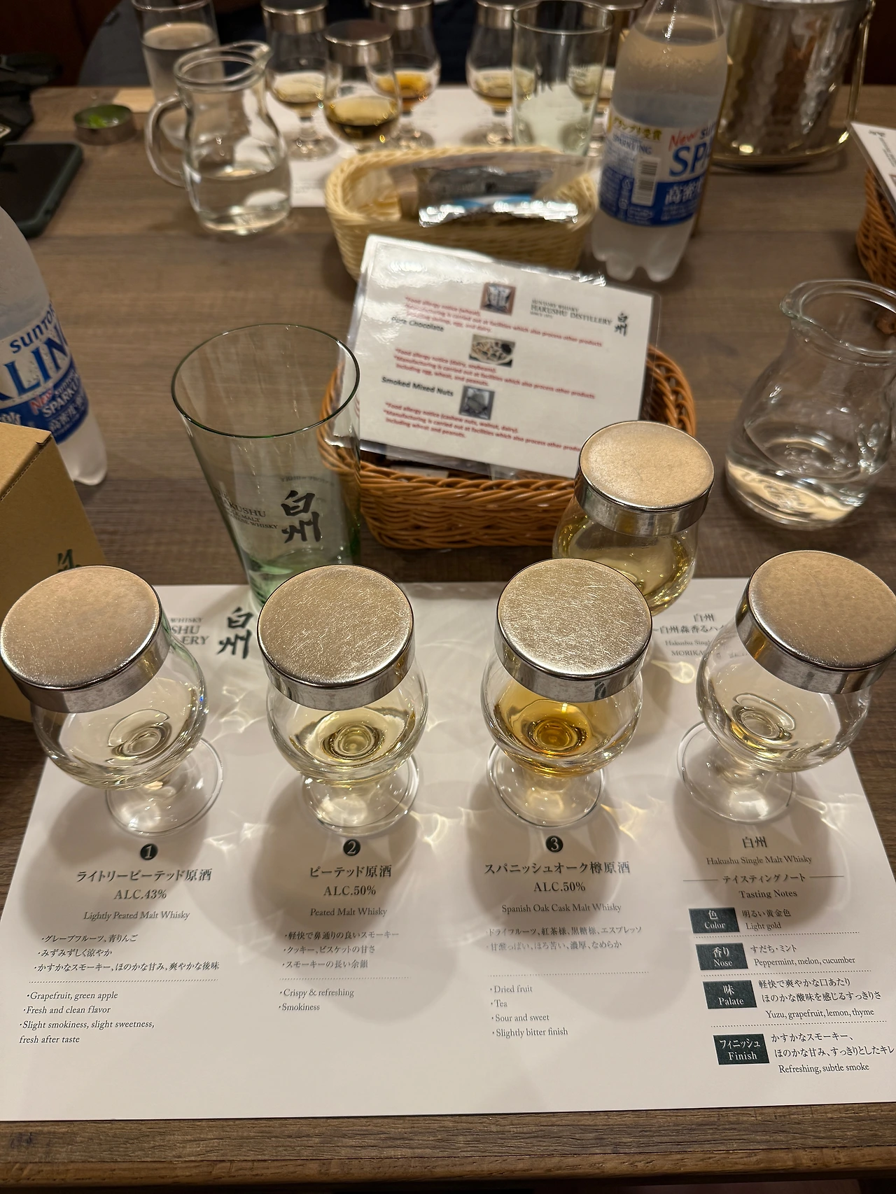 숙성고 구경까지 마친 후 시음을 할 수 있는 바 하쿠슈로 이동했다. 시음했던 위스키는 lightly peated, peated, spanish oak cask와 하쿠슈 dr이었다. 시음하며 느낀 점은 하쿠슈 특유의 피트향이 굉장히 매력적이라는 것이다. 사실 이번이 나의 첫 하쿠슈였는데, 이런 피트는 처음 느껴보았다. 아일라 섬의 피트 위스키들과는 또 다른 매력이 있었다. 재패니즈 위스키 특유의 가볍고 청량한 느낌에 피트가 더해지니 굉장히 잘 어울렸다. 시음 때에는 위스키 아로마에 대해서도 알려주었고, 하이볼 레시피도 알려주어 만들어 마셨는데, 하쿠슈 하이볼은 정말 최고인 것 같다.