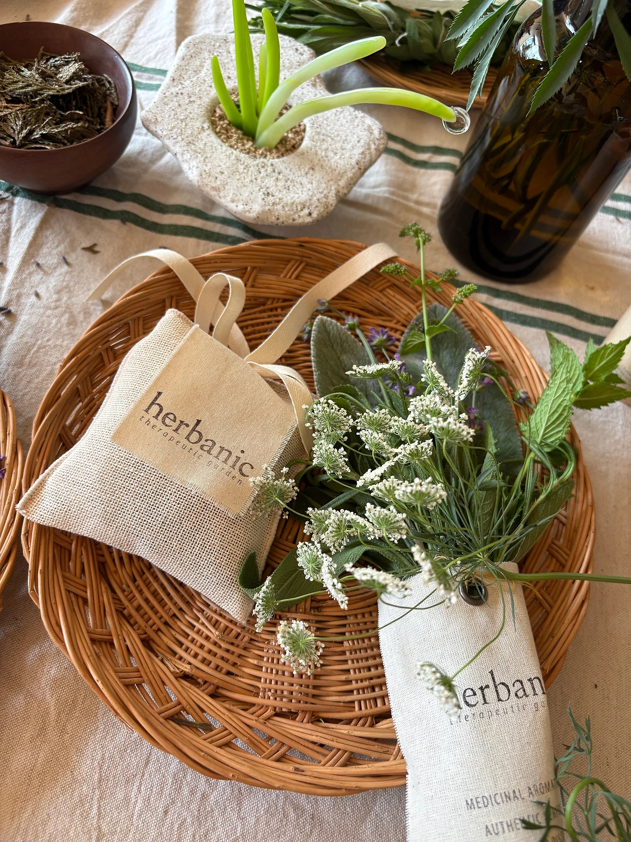 두번째과정은 허바닉에서 허브티를 마시면서 유기농과 아로마에 대한 이야기를 듣고 드라이허브로 사쉐를 ,생허브로 작은 묶음을 만들어 향을 나눈다.