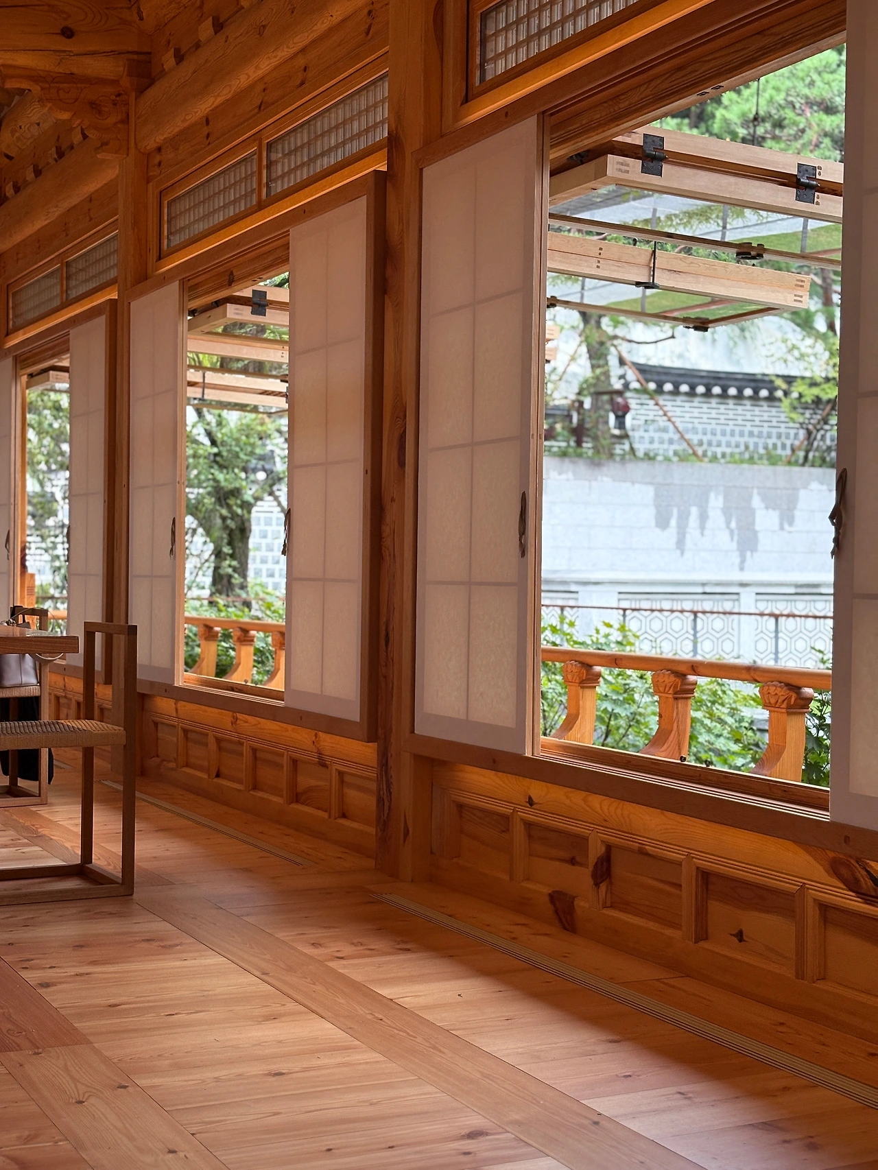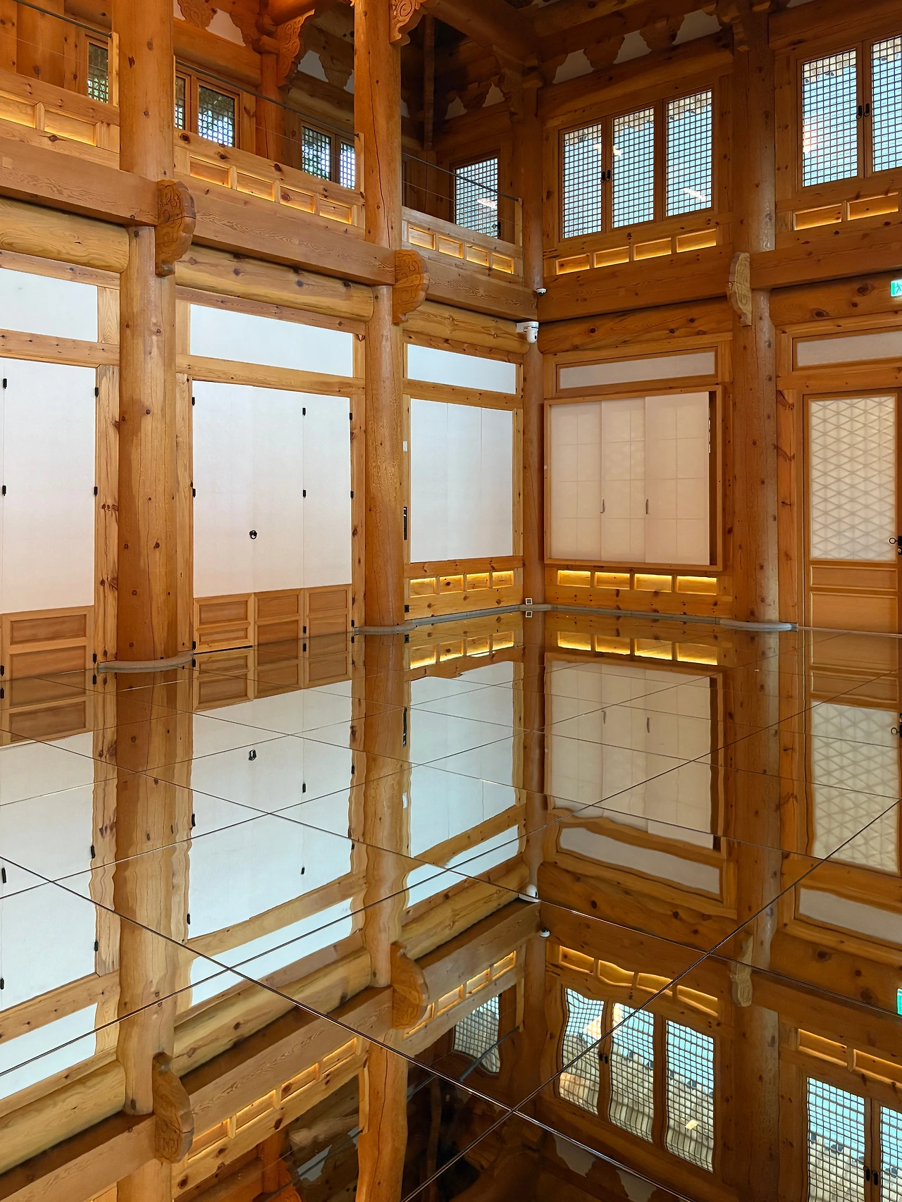 거울패널이 깔린 한옥공간은 덧신 신고 들어가는데 거울효과로 천장의 아름다움을 발밑에서 감상할 수 있고깊은 공간감을 느낄 수 있어 굉장히 인상적이다.