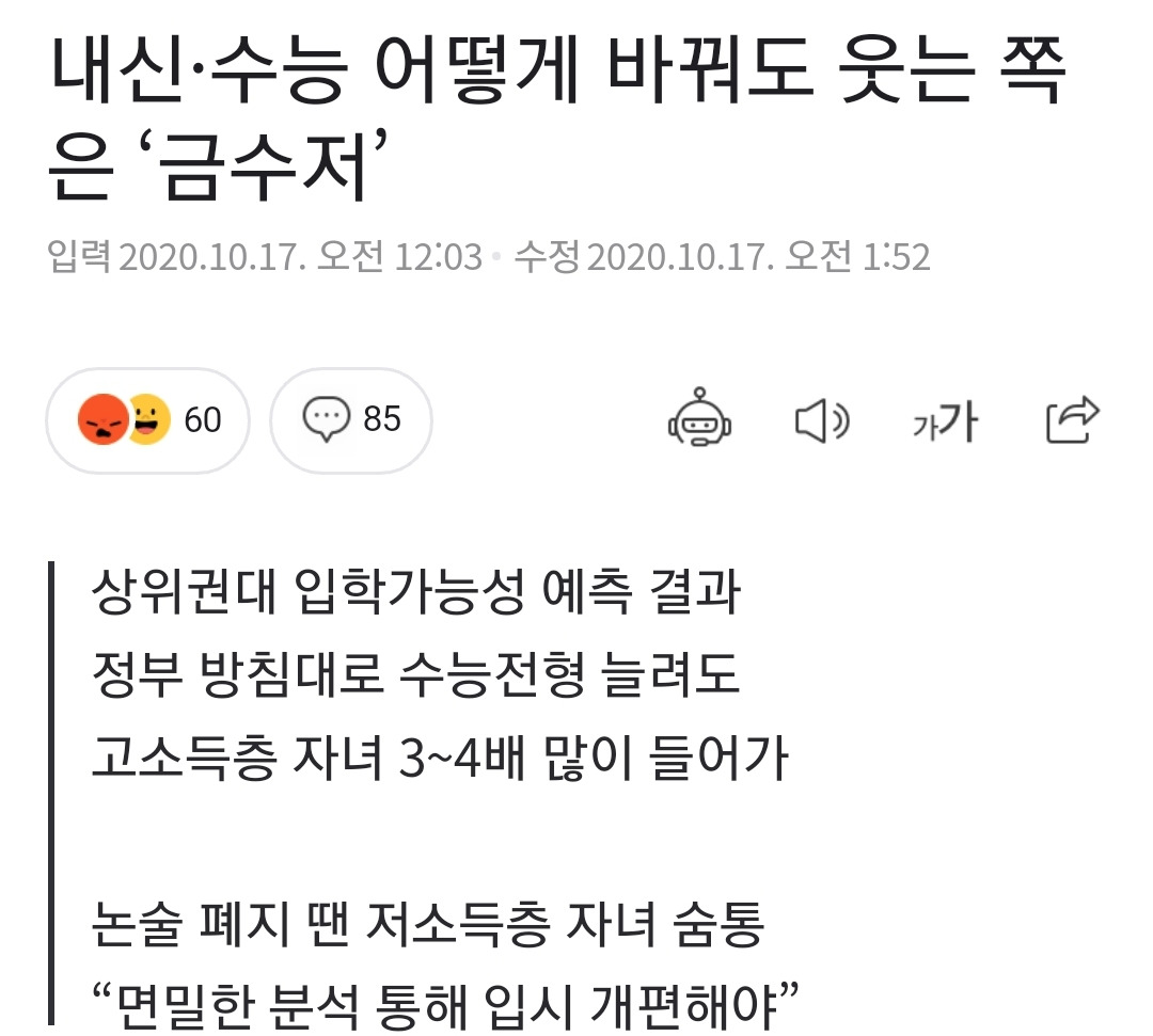 대입관련 기사가 대부분 금수저 비판 내용으로 나오고 있다