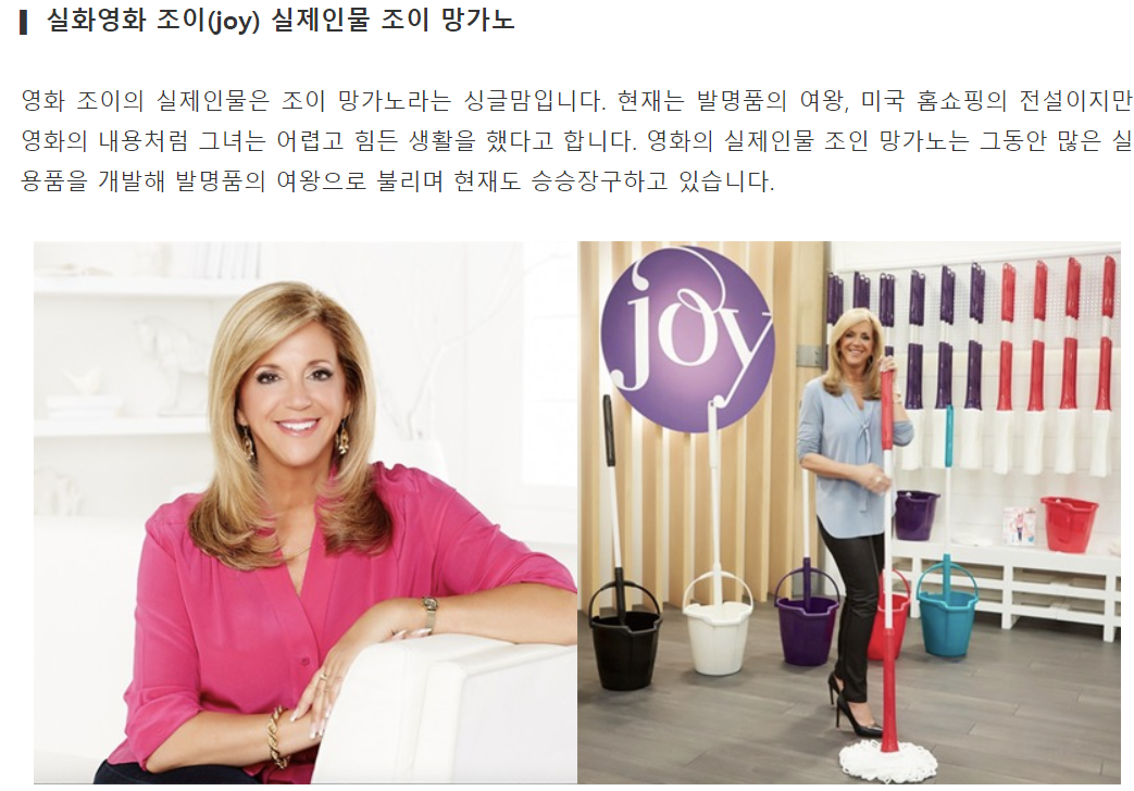 조이라는 영화를 보았다. 여성 창업가로 미국에서 성공한 케이스로 알려지고 있었고 실제 생활에서 아이디어를 얻어 직접 상품화를 한 경험을 바탕으로 극이 이루어지고 있다.
