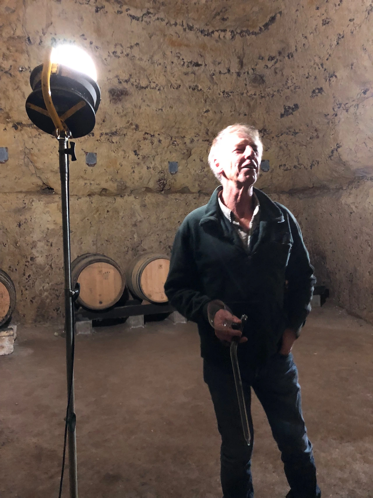 그는 심지어 자신이 만든 와인들에게 나쁜 파장을 주고 싶지 않아 전기 파장이 없는 전구 스탠드를 구했다고 한다. 그는 사진과도 같이, 전구 스탠드를 직접 들고 다니며 우리에게 와인을 설명해주었다.