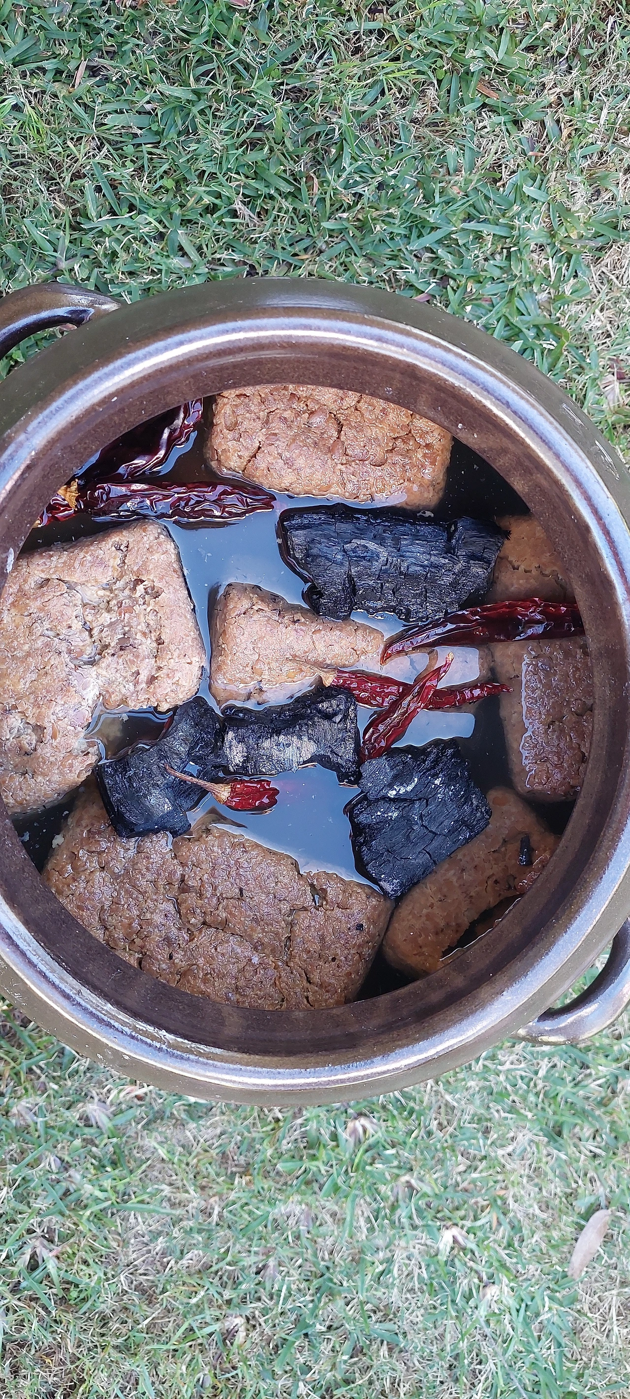 9. 메주가 소금물에 잠기게 한다. 숯, 마른 고추를 넣는다.