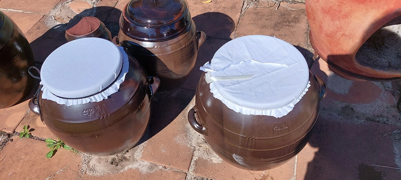 13. 간장, 된장 항아리에 면포를 씌워 해가 좋은 날 뚜껑을 열어 햇볕을 항아리에 담는다.