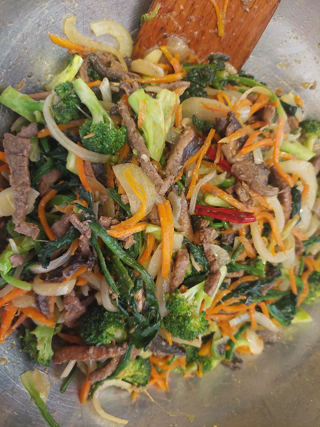 고기를 볶다가 거의 익었을 무렵 버섯을 함께 볶았고 브로콜리와 시금치는 무쳐서 따로 볶았다.