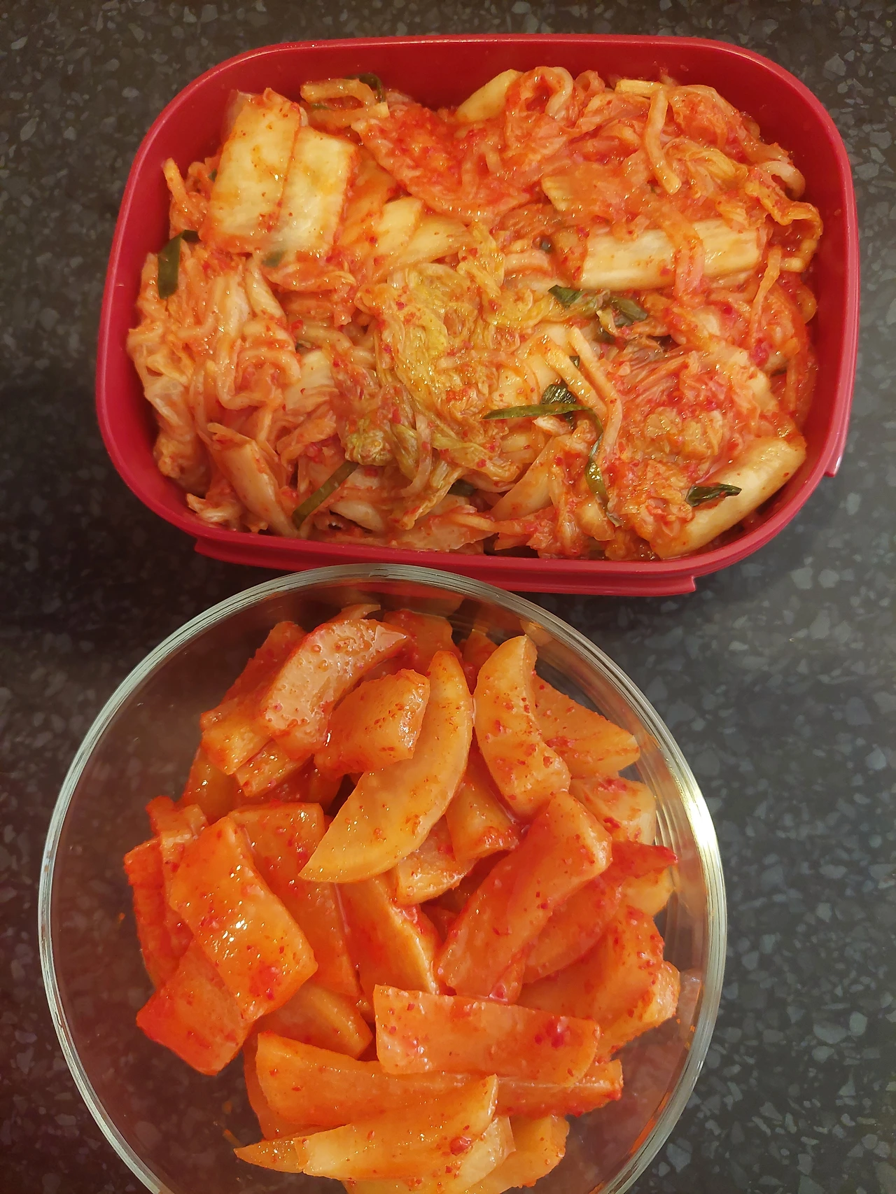 김치와 지난겨울 담았던 무장아찌를 양념 넣고 무쳐서 한 통 담았다.