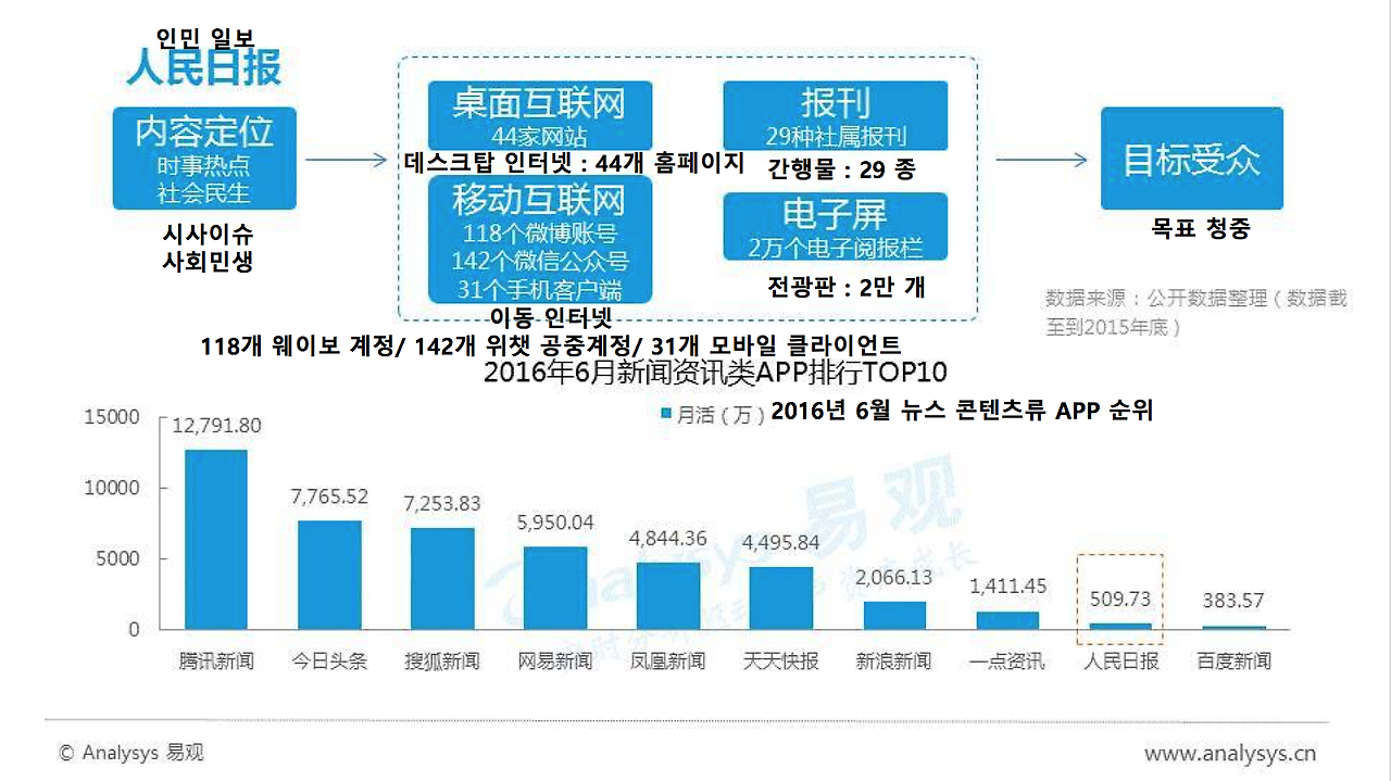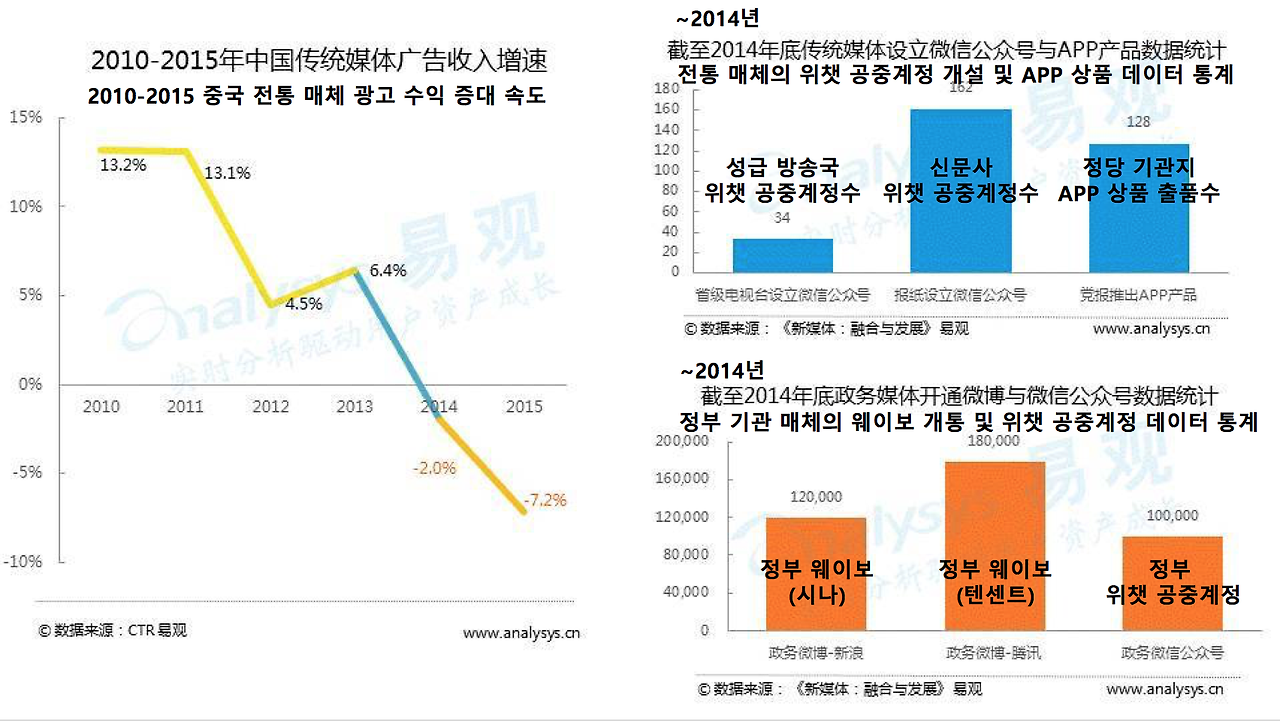 중국 전통 매체의 광고 수익 증대 속도는 2014년에 -2%, 2015년에 -7.2%를 기록했다. 2014년은 매체 융합의 원년이라 불리던 시기로 온라인 양미일단(两微一端 , 웨이보와 위챗, 모바일 뉴스 클라이언트를 가리킴)이 전통 매체 발전 융합의 수단이 됐다. 그해 말까지 전국 성급 방송사 중 34곳과 162곳의 신문사가 위챗 공중 계정을 개설했으며 128개의 정당 기관지가 단독 App를 출품하였다. 정부 기관에서는 연이어 웨이보와 위챗 공중계정을 개설하는 모습을 보이기도 했다.