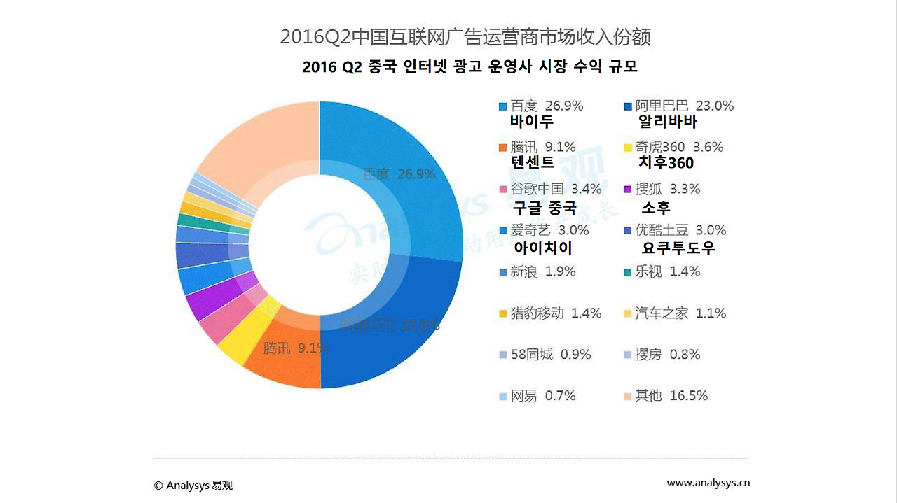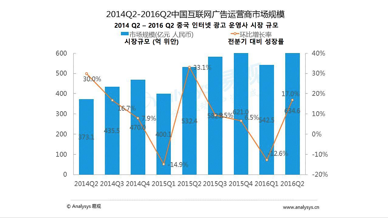 2016년 H1 중국 인터넷 광고 시장의 규모는 1177억 원에 달한다. 그중 Q2 시장 규모는 634.6억 위안이며 전분기 대비 성장률은 17%이다. BAT의 인터넷 광고 시장의 수익 점유율은 50%를 상위한다. (바이두 26.9%, 알리바바 23%, 텐센트 9.1%)