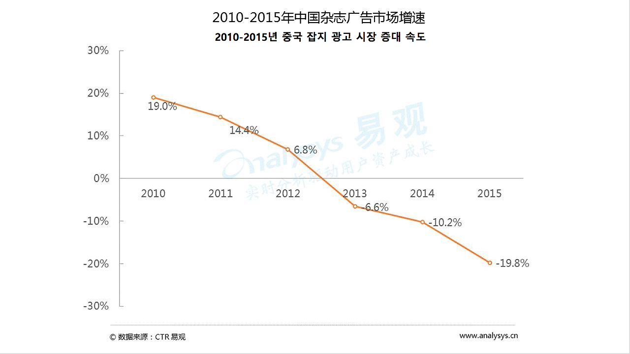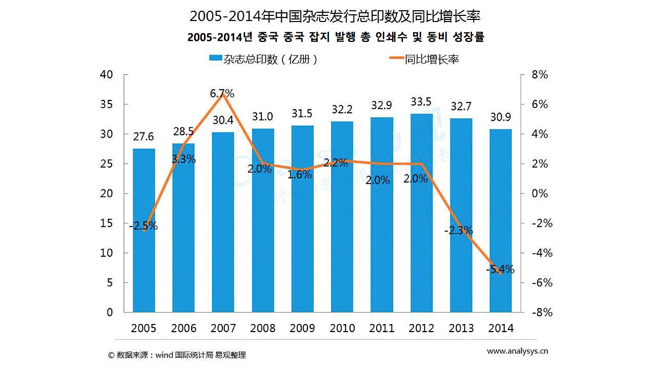 2013년 중국 잡지 광고 시장의 증대 속도는 -6.6%이고, 2015년에는 -19.8%까지 하락하였다. 잡지와 신문이 동일한 모습을 보이며 온라인 운영으로 전환하는 추세이다. 2014년의 인쇄수 잡지 발행 총 인쇄수도 동비 대비 5.4% 하락한 30.9억 부를 기록하는 등 고전을 면치 못했다.