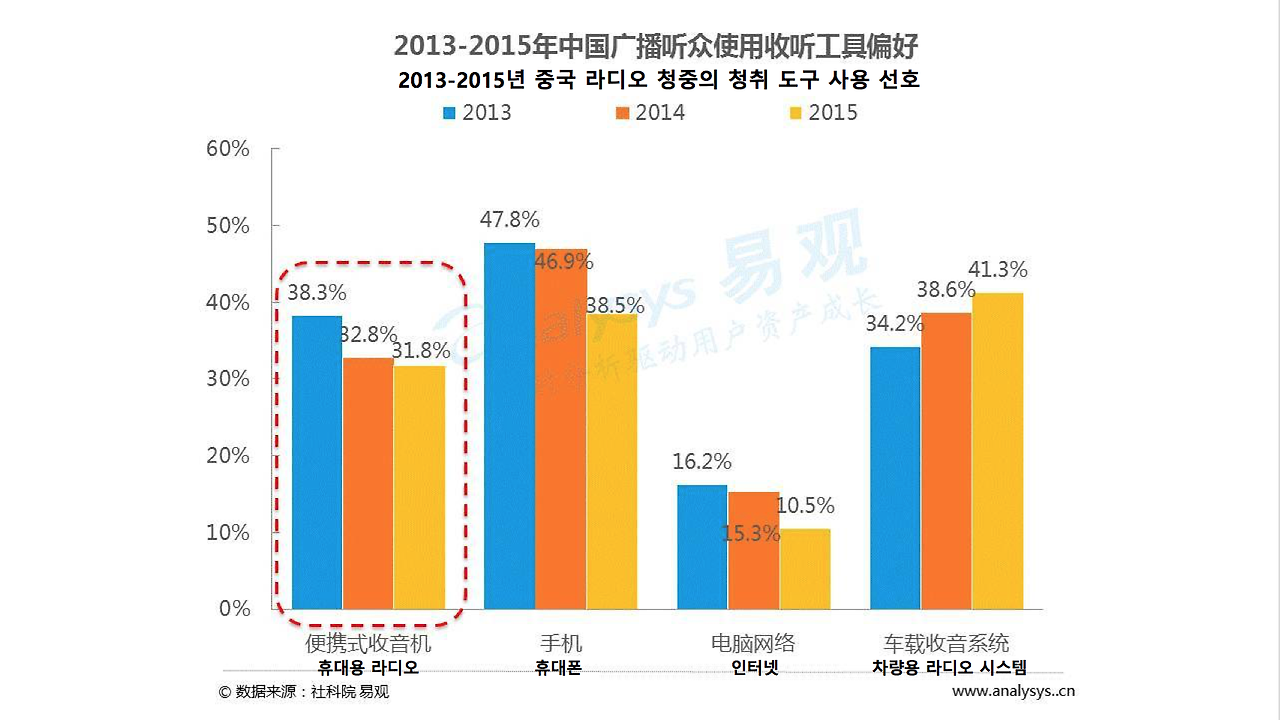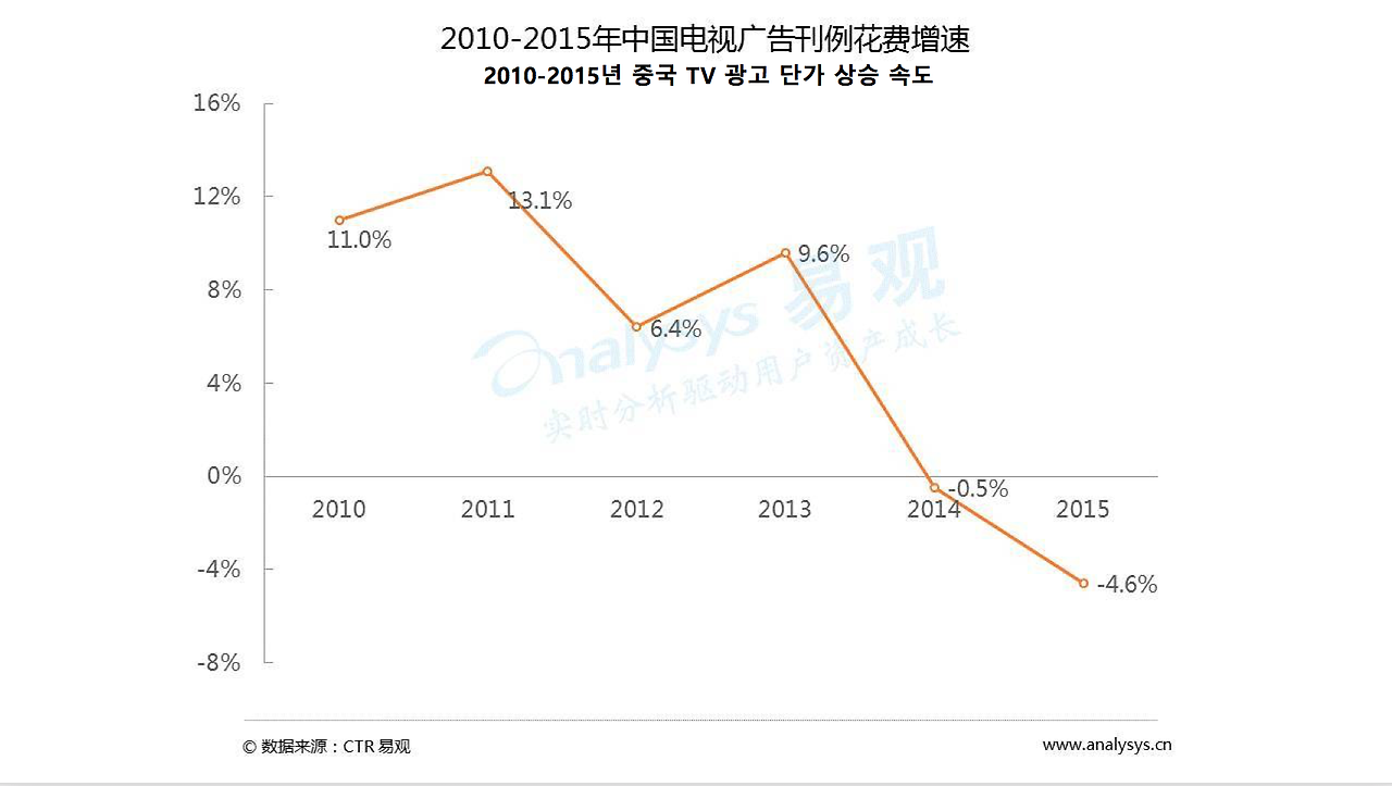 2014년 중국 TV 광고 단가 상승 속도가 -0.5% 로 집계됐다. 2015년의 단가 상승 속도는 -4.6%이다. 2014년 CCTV의 광고 수익이 바이두에 추월당하는 등 TV 광고 수익이 점차 인터넷 광고에 자리를 빼앗기고 있다. 이외에 2015년 라디오 청취자의 청취 도구 선호도 중 휴대용 라디오는 31.8%를 차지하며 예전의 위상을 잃었다. 날이 갈수록 많은 사람들이 차량용 라디오를 통해 라디오를 청취하고 있다.