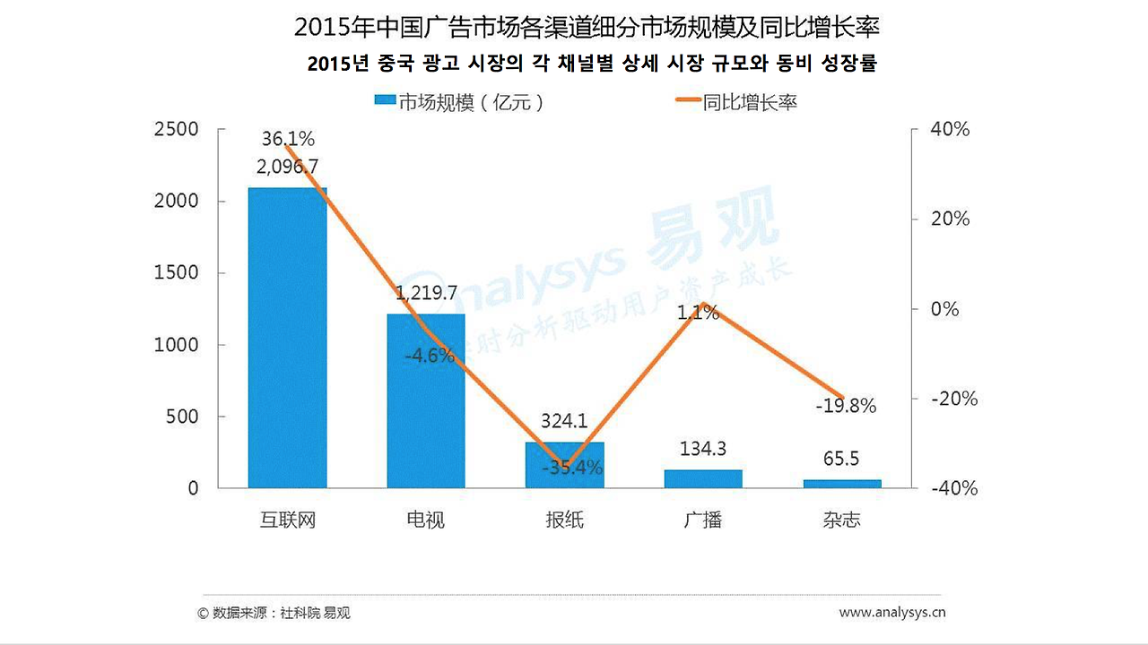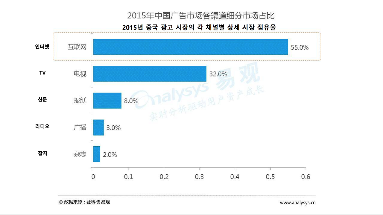 인터넷 광고가 2015년 중국 광고 시장의 반을 넘는 55%를 차지하고 TV, 신문, 라디오, 잡지를 포함한 전통 매체의 총합이 나머지 45%를 점유하고 있다. 인터넷 광고의 공격에 전통 매체가 맥을 못 추고 있다. 2015년 각 채널 별 시장의 증대 속도 통계 수치도 인터넷 광고는 36.1%로 승승장구하고 있는 반면 전통 매체인 신문은 -35.4%, 잡지는 -19.8%, TV는 -4.6%로 모두 저조한 성적을 보였다.