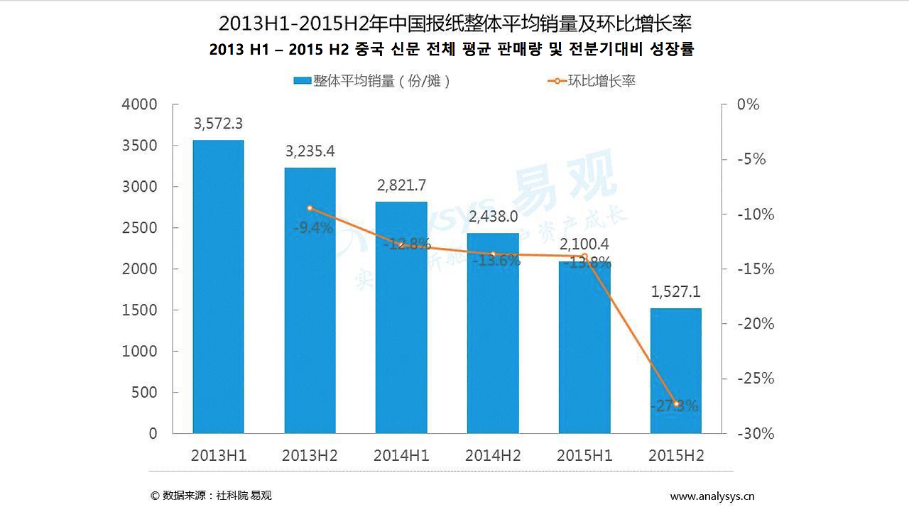 2012년의 중국 신문 광고 시장 증대 속도는 -7.5% 이며, 2015년엔 -35.4%를 기록했다. 중국의 신문이 역사의 뒤안길로 사라지느냐 온라인 서비스를 시작하느냐의 갈림길에 놓여있는 것이다. 판매량이 계속 떨어지고 있으며 2015년 H2 중국 신문 전체 평균 판매량은 노점 당 1527.1부로 전분기 대비 27.3% 하락한 수치를 보였다.