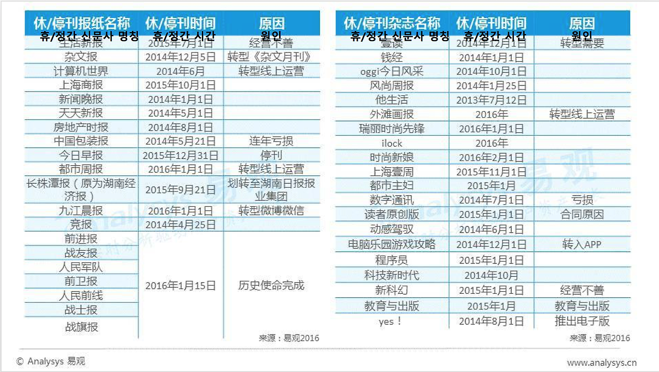 이미 휴/정간을 발표한 신문사와 잡지사의 중 대부분은 적자로 인한 폐간과 온라인 운영으로의 전환의 기로에 놓여있다. 상단 차트에서 볼 수 있듯 2014년과 2015년 2년 사이에 다수의 신문사와 잡지사가 문을 닫았다.