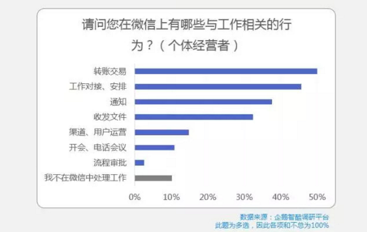 규모가 작은 웨이상(微商)들 사이에서 위챗의 업무 공간화는 매우 뚜렷한 모습을 보이며 진행중이다. 90% 이상의 개인 경영자들이 위챗을 통해 업무를 진행한다고 답했다.