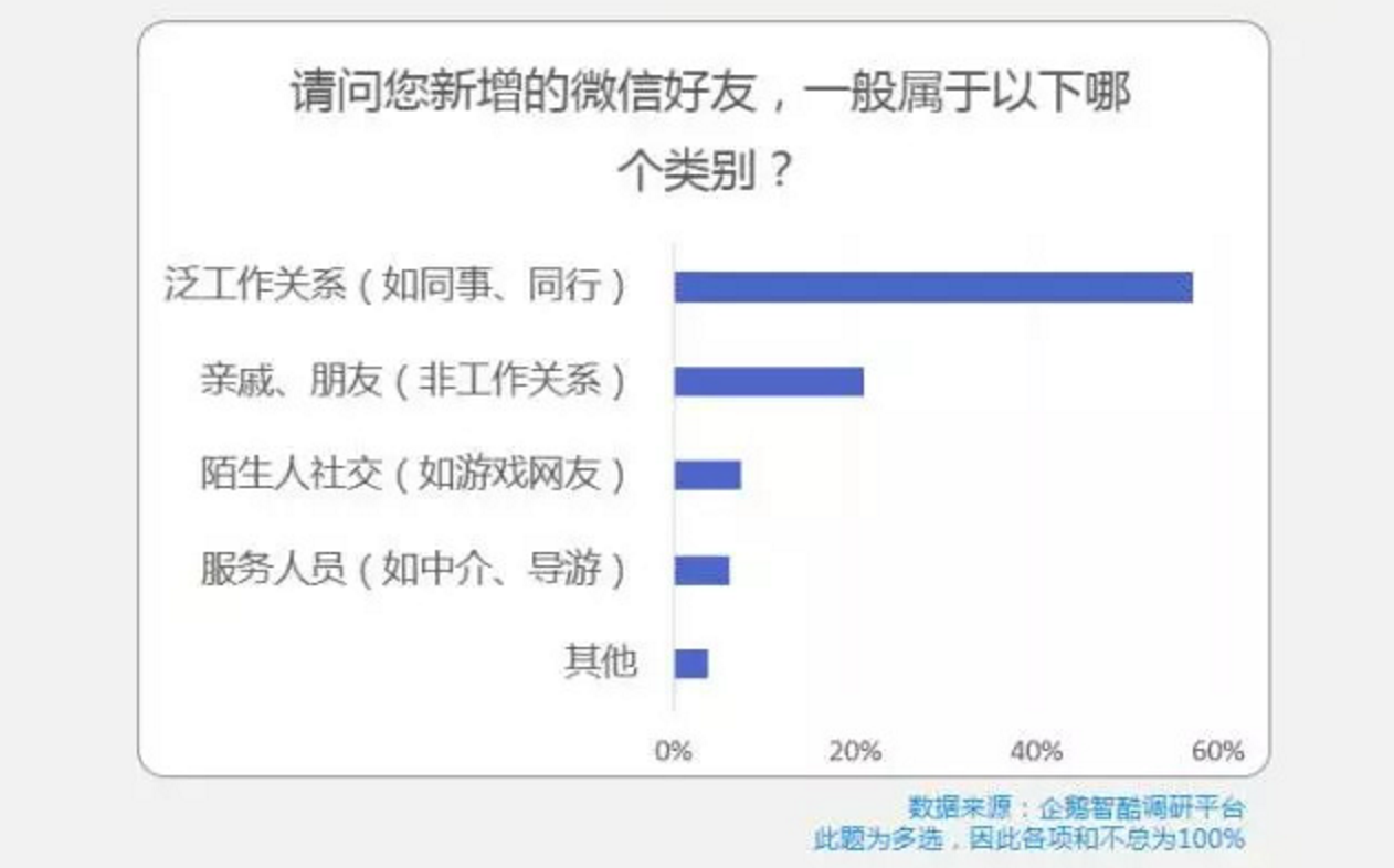 위챗을 통한 사람들간의 네트워크는 개인과 높은 친밀도를 갖고 있는 가족과 친구에서 연결성이 약한 직장으로 확장된다. 설문 응답자 중 57.22%는 위챗 친구의 범위가 이미 업무 관련 네트워크로 확장되었으며 기업 관리 부서에서 근무하는 응답자들 중 74.3%는 새로 추가하는 친구들은 대부분이 업무와 관련된 사람이라고 답했다. 직장 내의 사교 활동은 이미 위챗을 통한 사교 활동의 중요한 일환으로 자리잡았다.