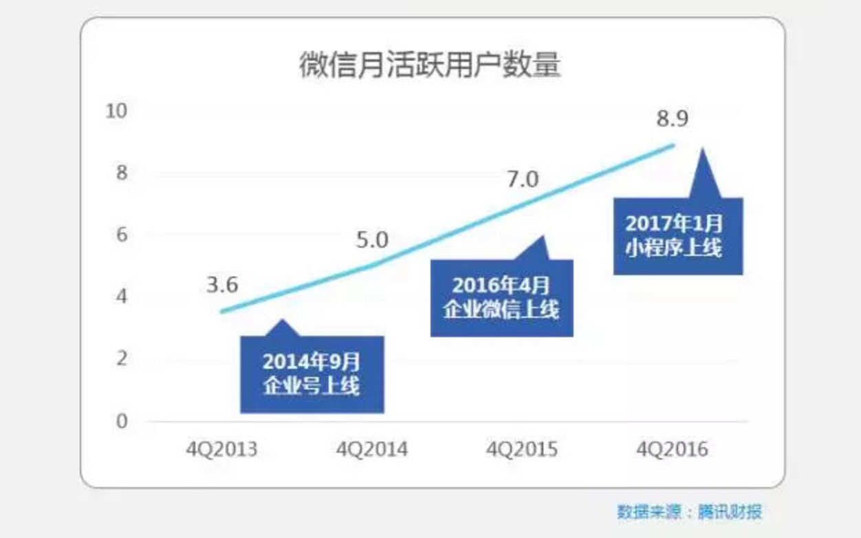 2016년 12월까지의 데이터를 기준으로 한 웨이신과 WeChat(위챗 해외버전)의 액티브 유저 총합이 무려 8.89억 명에 달했다.