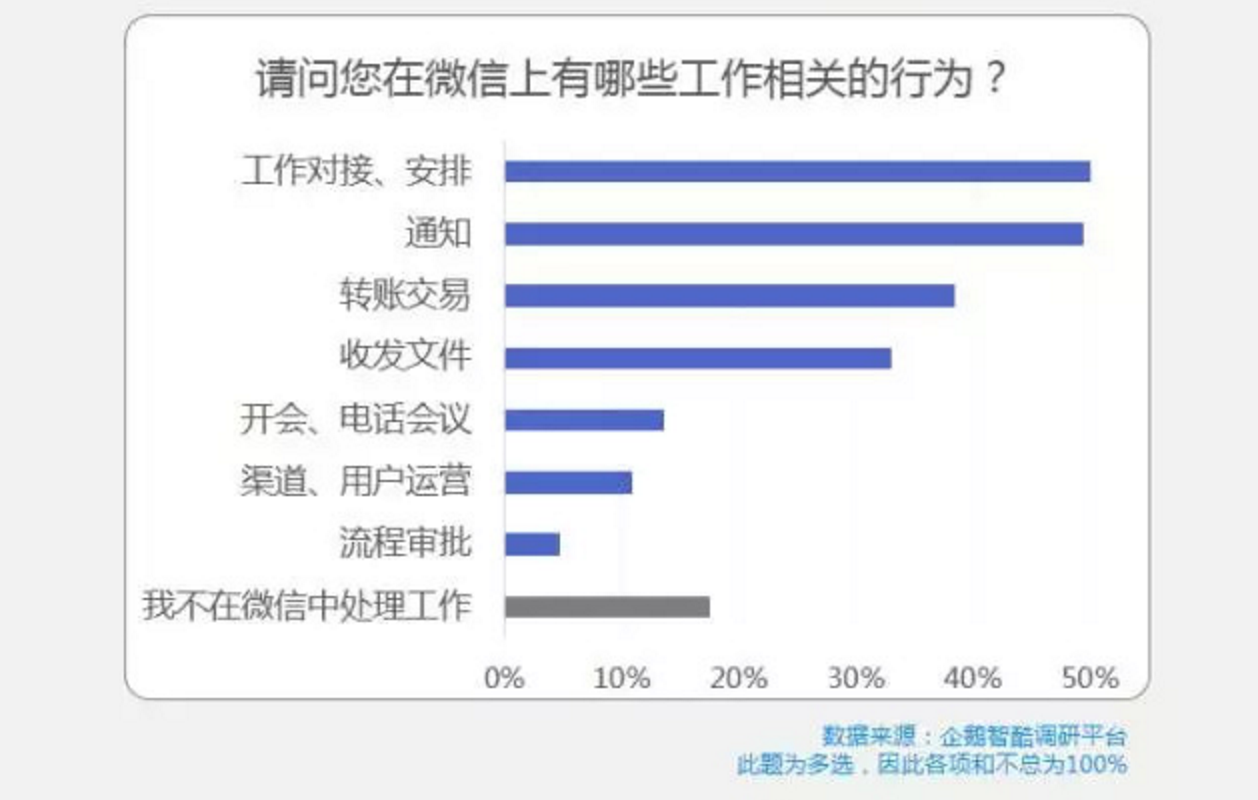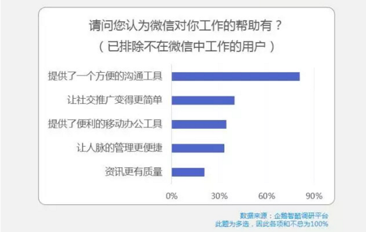 설문 응답자의 80.9% 는 위챗이 업무용 메신저로 변화할 수 있었던 핵심을 소통과 네트워크 확장을 돕는 도구였기 때문이라고 답했으며 34.5% 의 유저는 위챗이 편리한 모바일 업무 도구를 제공했다고 생각한다 답했다.