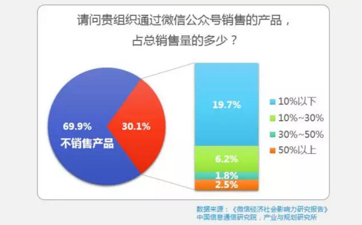 공중 계정 운영자의 10.4%는 위챗 공중 계정을 통한 상품 판매가 전체 판매율의 10%를 차지했으며 80% 이상의 판매율을 기록한 공중 계정 운영자는 전체의 1.3%인 것으로 조사됐다.