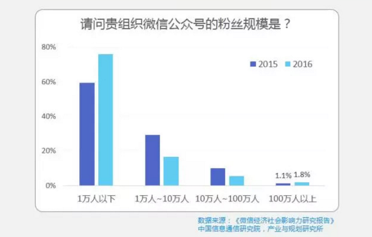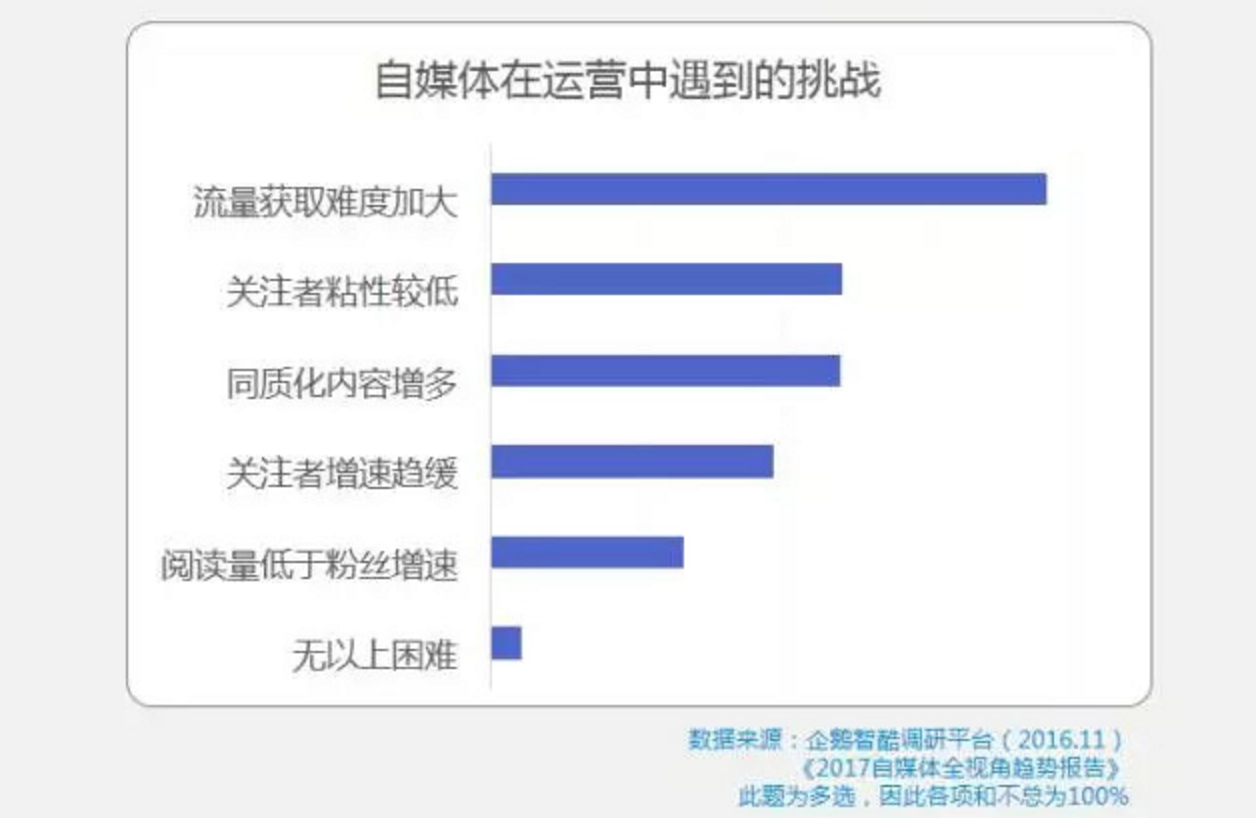 공중 계정 운영자의 76.5%는 공중 계정 운영의 가장 큰 어려움을 유저와 구독량 증가의 침체라 답했다. 《위챗 경제 사회 영향력 연구 보고》의 조사 데이터에 따르면, 현재 위챗 내에서 운영되는 공중 계정은 1,000만 개를 넘어섰다. 공중 계정의 폭발적 증가에 따라 콘텐츠 동질화 문제가 심각해졌고 정보 과부화를 느끼는 유저들이 많아지며 1인 미디어 공중 계정 운영의 어려움이 배로 증가했다.