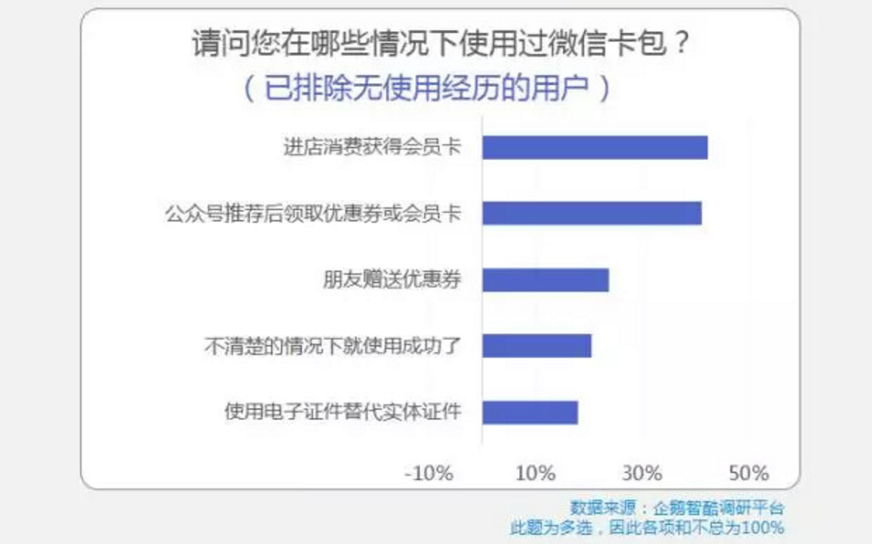 위챗 카드 지갑이 위챗 페이와 연결되며 오프라인 결제 영역에서 뛰어난 융합 능력을 보이고 있다. 사용자 중 42.5%는 오프라인 매장에서 결제 후 얻은 회원카드를 통해 위챗 카드 지갑을 이용한 적이 있다고 답했다.