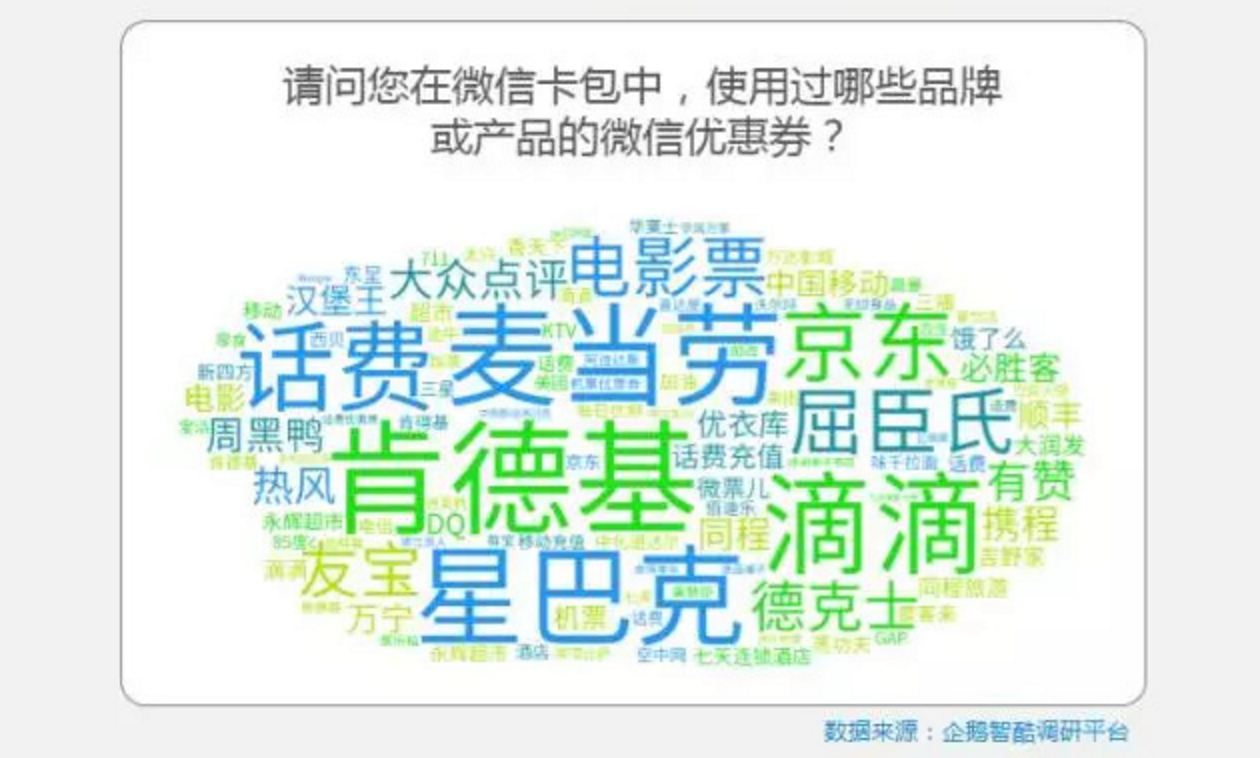 위챗 카드 지갑을 통한 홍보 효과 중 음식 체인점에 대한 유저들의 인지도가 가장 높았다. 이 외에 유저들이 자주 접하는 友宝 자동 판매기나 전화 요금 충전 쿠폰 등이 인기를 얻었다.