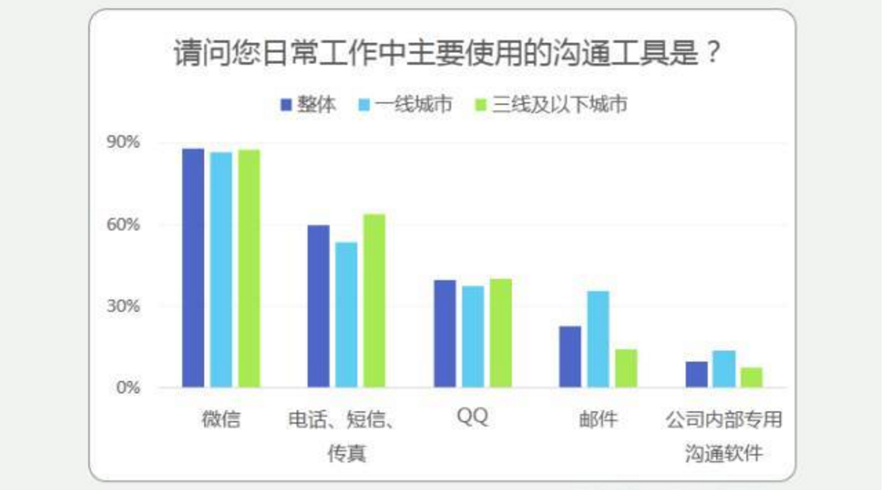 위챗은 이미 사람들의 업무 소통 채널로 자리잡았다. 업무 중 소통의 효율을 높이기 위해 위챗과 전화와 같은 매체를 사용하는 유저들이 많아지고 있다. 그러나 1선 도시에서는 이메일과 같은 비동기 대화 매체들을 더 중시하는 모습을 보였다.