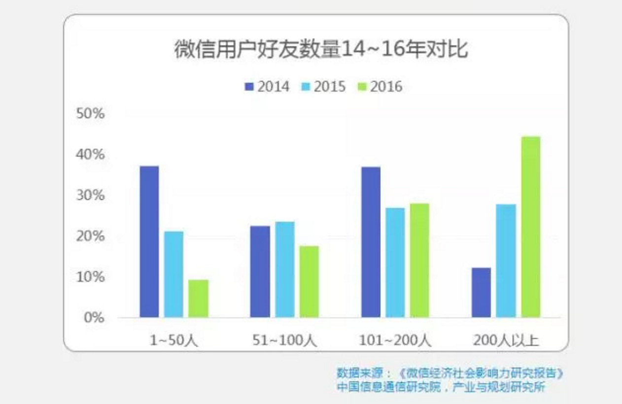 위 표를 보면 위챗 유저의 친구 규모가 2014년에 비해 대폭 증가했다는 것을 알 수 있다. 중국 데이터 통신 연구소의 조사에 따르면 위챗 친구수가 200명 이상인 유저들의 비중이 45%에 달했고 그중 친구수가 500명이 넘는 유저들은 전체의 13.5%로 기록됐다. 위챗이 하나의 소통 도구가 되며 최근 몇 년간 사람들 간에 생성된 네트워크의 한계를 없애는 데 큰 도움을 주었다. 이 배후의 서비스 로직과 유저들의 SNS 사용 목적의 변화를 지켜볼만 하다.