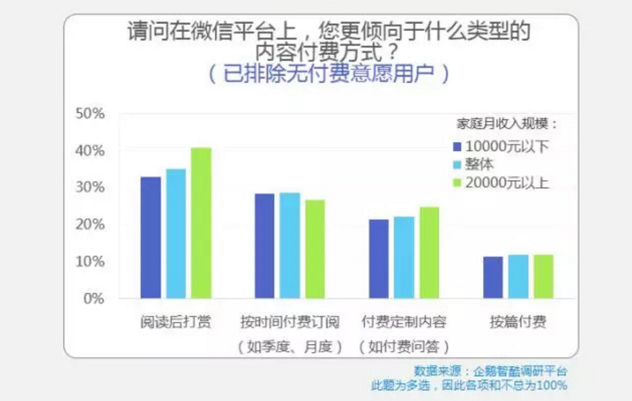 유저들은 구독수와 콘텐츠 수에 따라 대금을 지불하는 방식보다 선 구독 후 가치있다 생각하는 콘텐츠에 돈을 지불하는 팁 형식의 대금 지불 방식을 선호했다. 그중 월 소득이 20,000위안 이상인 유저들의 팁 형식의 지불 방식에 대한 선호도는 타 유저층보다 높은 것으로 조사됐다.