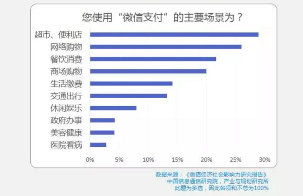 위챗 페이에 대한 유저의 인지도를 조사한 데이터에 따르면 편의점과 상가와 같은 오프라인 결제 영역에서 위챗 페이는 좋은 성적을 보이고 있다.