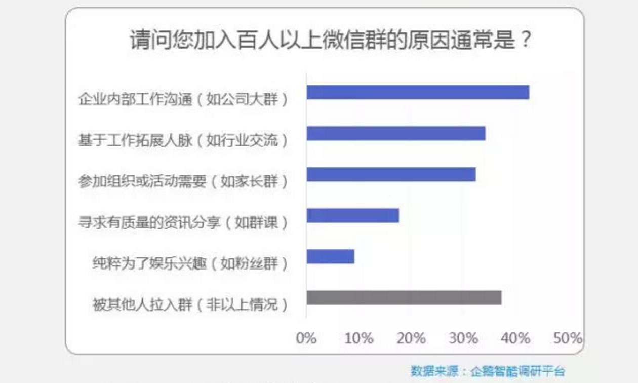 그러나 37.3%의 유저들은 자신의 의도와는 상관없이 다른 사람에 의해 단체 채팅방에 들어가게 되었다고 답했다. (웨이상 광고를 위한 채팅방 등)