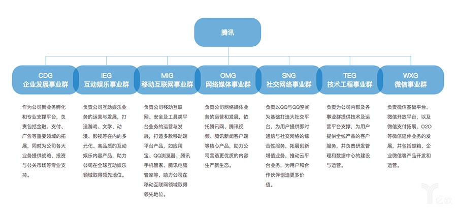 텐센트는 2005년과 2012년에 조직 구조 개편을 진행했다. 두 차례의 조직 구조 개편을 통해 위와 같은 구조가 만들어졌다.