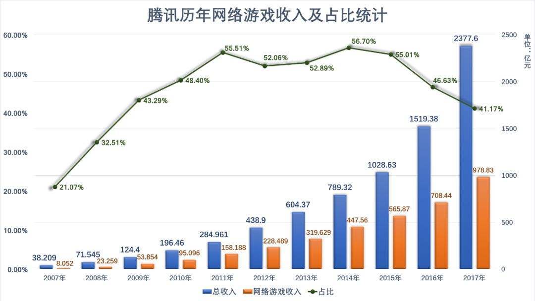 앞서 말한 바와 같이 텐센트 게임에서 발생되는 수익은 전체 영업 수익의 약 50% 정도를 차지한다. 하지만 게임 사업의 수익이 전체 수익에서 차지하는 비율은 2014년에 56.70%로 정점을 찍은 뒤 텐센트의 주식처럼 하향 곡선을 그리며 떨어지고 있다.