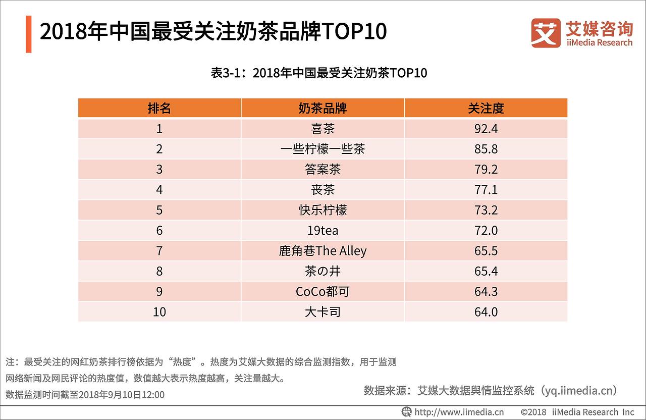 희차, Some Lemon Some Tea, 다안차(答案茶), 상차(Orz Tea), 해피레몬, 19tea, The Alley, Tea Well(茶の井), 코코 나이차, 다카쓰(大卡司)가 순서대로 중국 밀크티 브랜드 관심도 1위부터 10위를 각각 차지하였습니다.