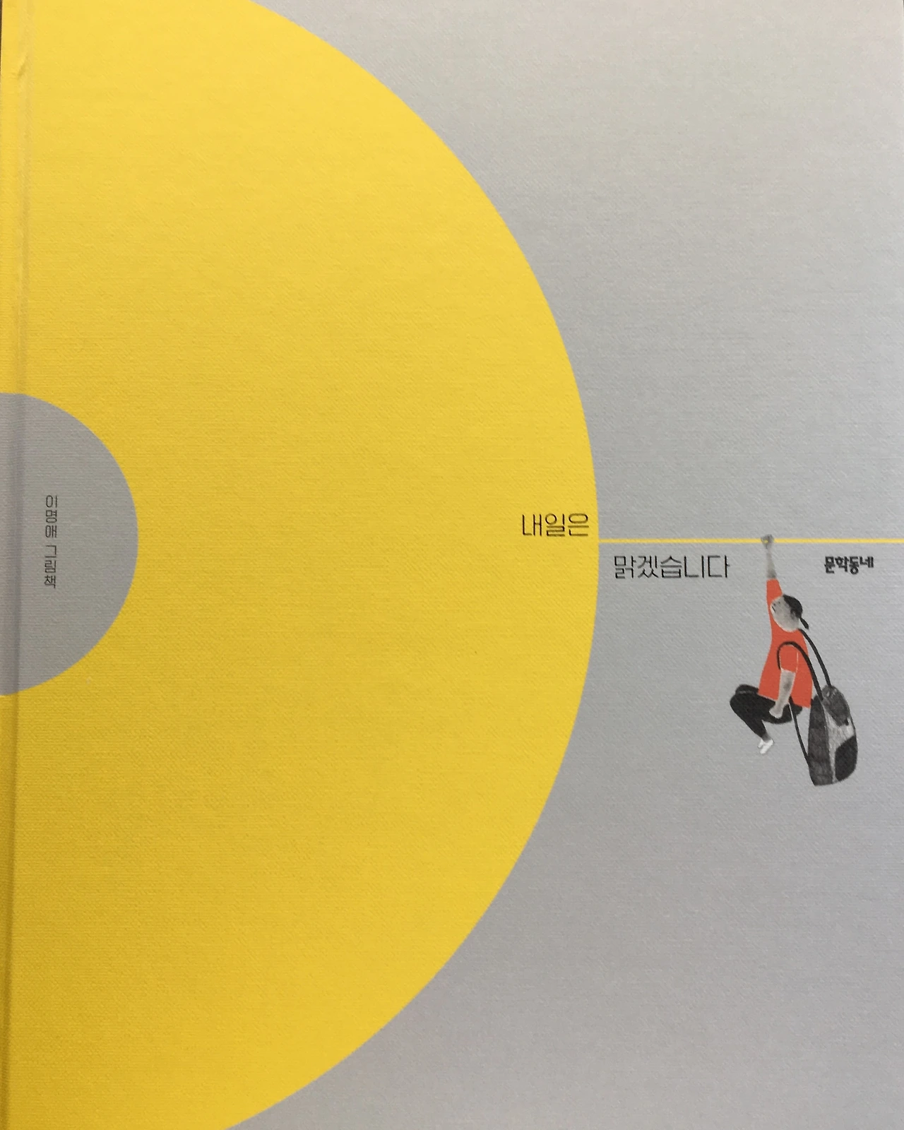 이명애의 <내일은 맑겠습니다>는 표지의 반을 차지하는 노란색 디스크로 시선을 끈다. 정확하게는 디스크를 앞표지와 뒤표지로 걸쳐 얹어, 책을 엎어서 펴면 둥그런 디스크를 볼 수 있다. 책 표지를 압도하는, 그러나 밝고 따듯한 이 노랑 덩어리는 우리에게 내일은 맑겠다고 알려준다.
