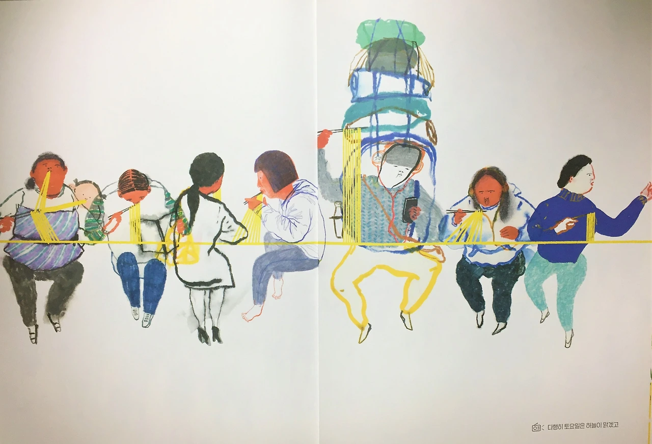 하루의 반이 지나, 그래서 우리가 허기지고 힘들어 한숨 돌리고 싶어 할 때 노랑선은 기꺼이 우리의 국수가 되어준다. 우리의 빳빳한 국수가 되어 그 힘을 우리에게 다 넘기는 기합을 넣어준다. 엄마도 등에 업힌 아기도 같이 빳빳한 노랑 국수를 나눠먹고 다시 움직일 빳빳한 힘을 얻는다.