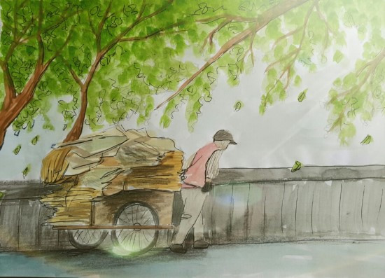 산더미 같은 짐을 실은 리어카를 끌고 가는 노인의 모습 뒤로 엄청나게 풍성한 나무들이 곧 초록을 왈칵하고 토해낼 것 같이 부대끼던 모습.