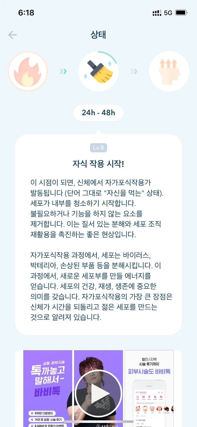 앱에서는 24시간이 지나자 내 몸이 자가포식 상태로 들어갔다고 했는데, 그게 그렇게 기분 좋은 말로 들릴지 몰랐다. 드디어 내 몸이, 내 몸에 약하고 쓸데없이 불어나 내 몸을 괴롭게 만드는 세포들을 청소하며 자가포식으로 먹어대고 있었다.