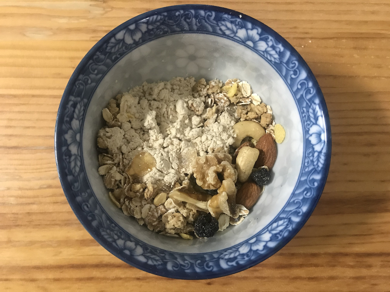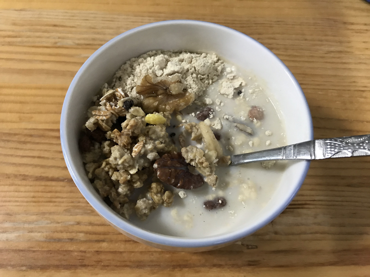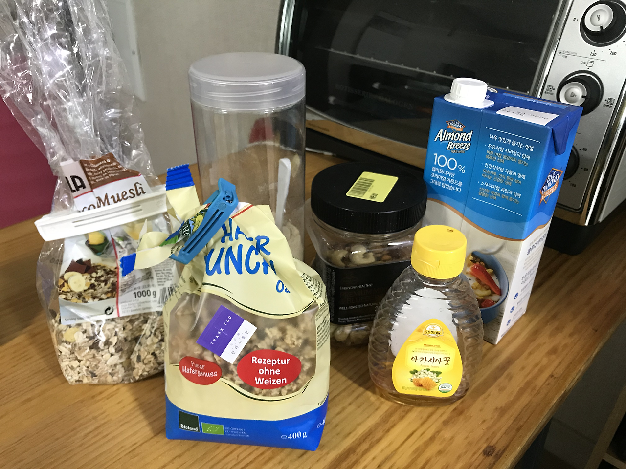 요새는 대부분 아침을 이렇게 뮤즐리에 이것저것 섞어서 먹는다.