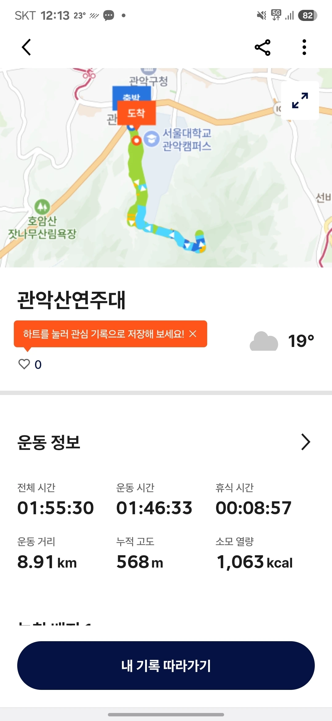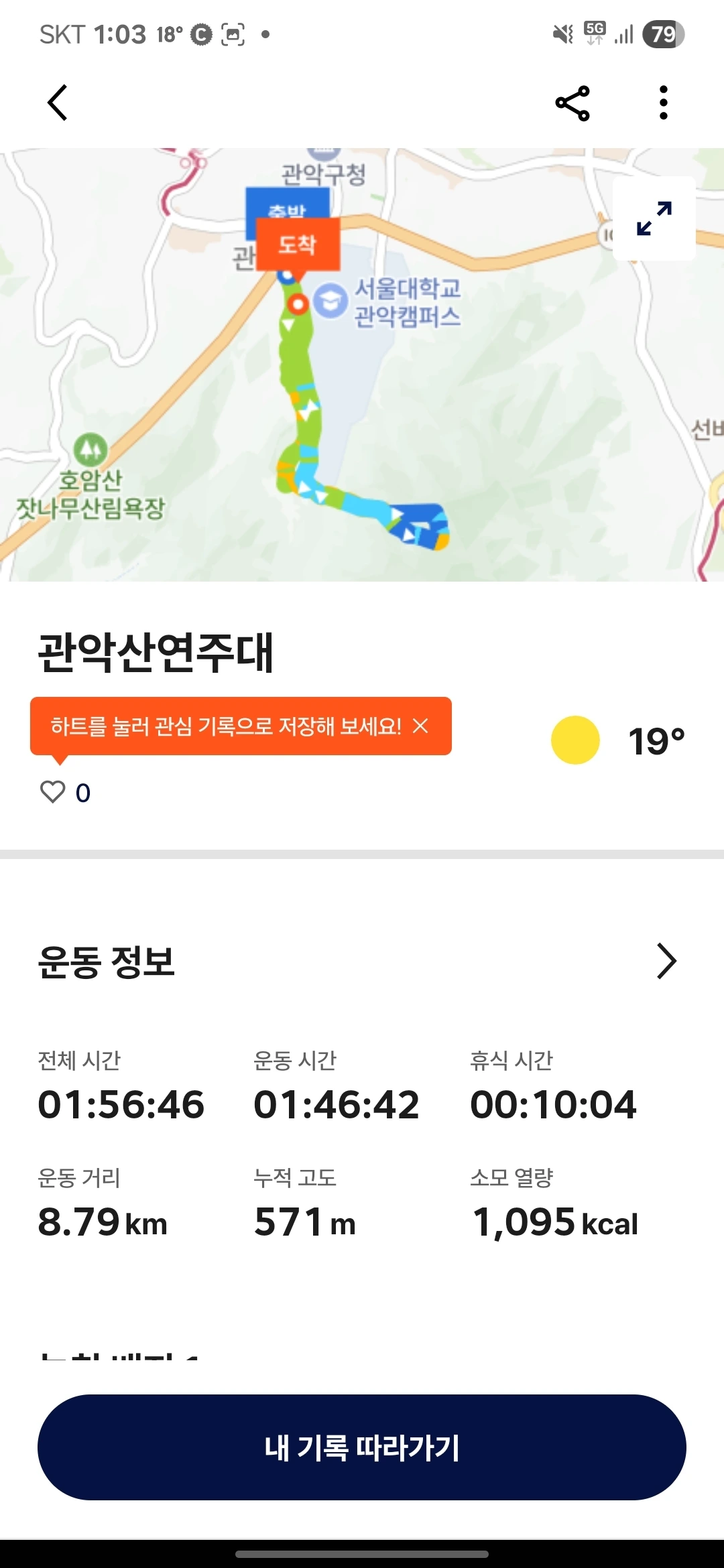 이렇게 뛰어내려와 기록을 보는 순간 2주 전의 기록이 단순히 우연이 아니었다는 사실이 증명되었다. 다시 한번 1시간 46분 만에 연주대 왕복을 끝마친 것이었다.