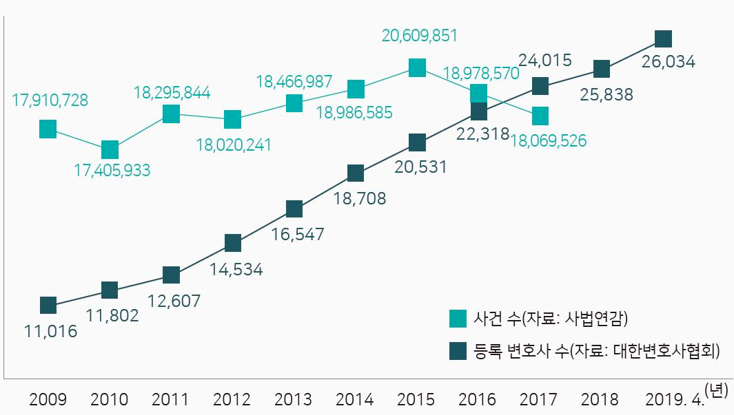 소송과 자문 업무를 벗어나 다양한 선택지를 향하는 변호사들이 늘어난 배경에는 법률 시장의 변화가 자리 잡고 있습니다. 2009년 1.1만 명 남짓이던 변호사 수는 2019년에 이르러 2.6만 명을 넘어섰습니다. 하지만, 변호사들의 도움을 필요로 하는 사건 수는 줄어들고 있습니다. 사람들은 클릭만 하면 내 사건과 유사한 판례를 검색할 수 있고, 법조문을 살펴볼 수 있으니까요. 법률전문가의 조언이 필요한 경우라 하더라도 전에 비해 훨씬 저렴하고 편리한 방법으로 필요한 만큼만 도움을 청할 수도 있습니다. 저도 변호사를 소개해 달라고 부탁하는 지인들에게 스스로 정보를 찾아 해결해 보라고 조언하곤 합니다. 절대적으로 전문가의 도움이 필요한 상황이 아니라면, 스스로 문제를 해결하는 과정을 통해 비용도 아끼고, 법률 공부를 해볼 수 있으니까요.