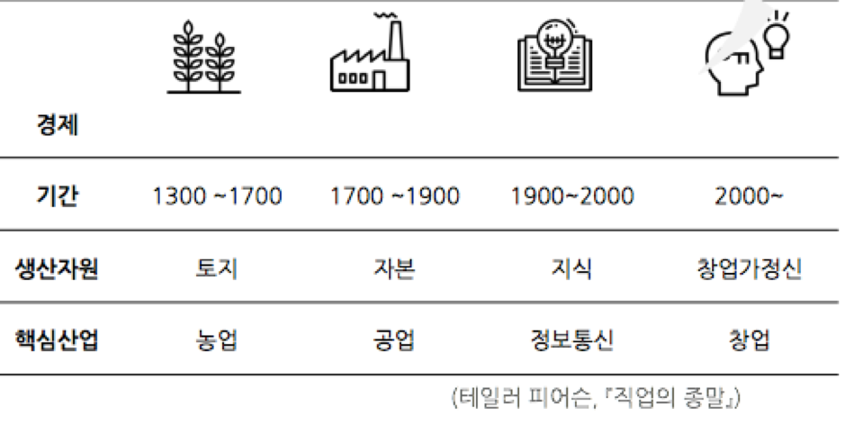 인류에게 토지가 유일한 생산수단이었을 무렵에는 ‘토지’가, 무역과 산업을 통해 부가 만들어지면서는 ‘자본’이 경제력과 신분상승의 기회를 창출하는 주요한 수단으로 작용했다. 산업화·정보화 시대에 접어들어 대중에게 학습기회가 주어지면서 ‘지식’이 신분상승의 수단으로 작동했다. 대한민국이 빠른 성장을 이룰 수 있던 이유 역시 경쟁적인 교육열을 배경으로 하고 있다. 대한민국 부모들은 좋은 대학, 좋은 직장(직업)이 성공으로 이어지는 특랙에 올라타기 위해 자녀 교육에 올인하고 있다. 그러나, 21세기에 들어 변화가 나타나기 시작했다. 명문대 졸업장과 전문직 자격증이 보장해주는 성공의 효율이 낮아지게 되었다. 좋은 대학, 전문직 자격증이 더 이상 성공을 보증해 주지 못하는 시대에 이르게 된 것이다. 이와 달리 개인이 접근할 수 있는 생산수단과 부의 창출 기회가 확대되면서 전과는 다른 성공의 계단이 생겨나게 되었다. 생산비용 감소와 유통구조의 대중화, 시장의 확대라는 변화 속에 창의력을 갖춘 개인이 할 수 있는 일들이 많아지게 된 것이다. 대규모의 자본과 노동력을 투자해야만 생산을 할 수 있던 고용 자본주의 시대가 저물고, 창조력을 갖춘 개인들이 손쉽게 기업가적 성취를 이룰 수 있는 기업가 자본주의로의 변화가 전방위적으로 나타나고 있다.